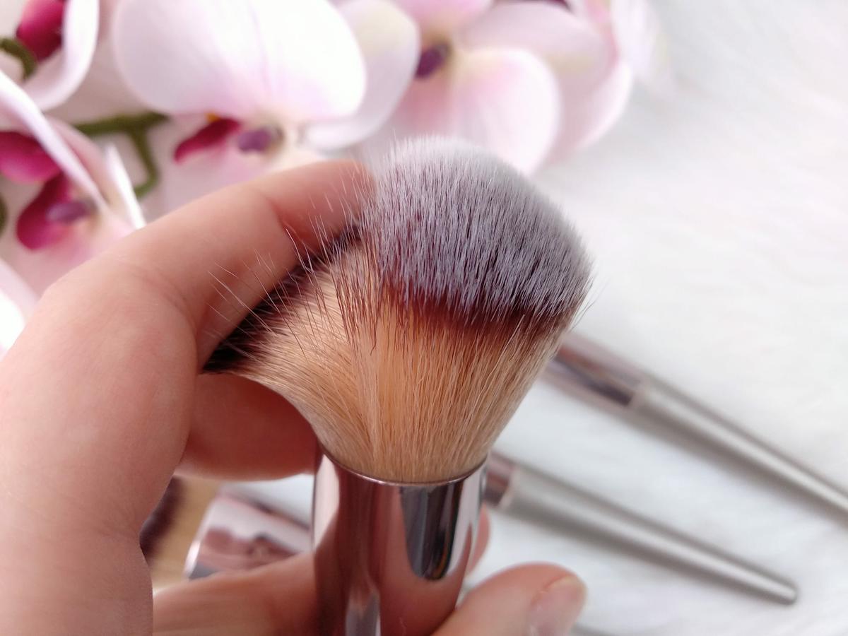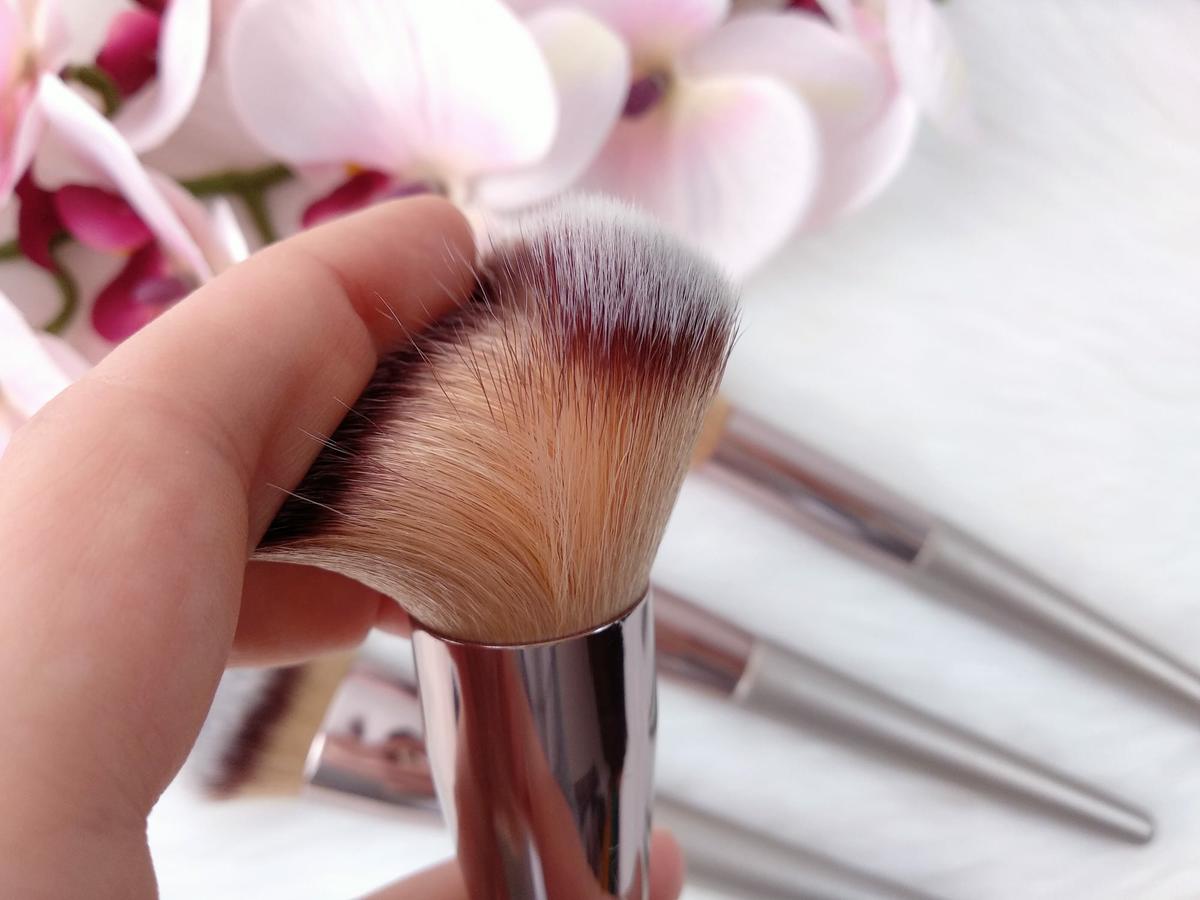 Mis dos favoritas (o a las que les estoy dando más uso) son la pequeña biselada y la grande redondeada. La grande biselada me parece muy buena brocha, pero yo casi nunca utilizo base de maquillaje, así que tampoco le estoy sacando mucho partido… Y la pequeña redonda es la que menos me convence. Creo que para el iluminador funcionan mejor las brochas más sueltecitas que depositen menos producto de una vez.