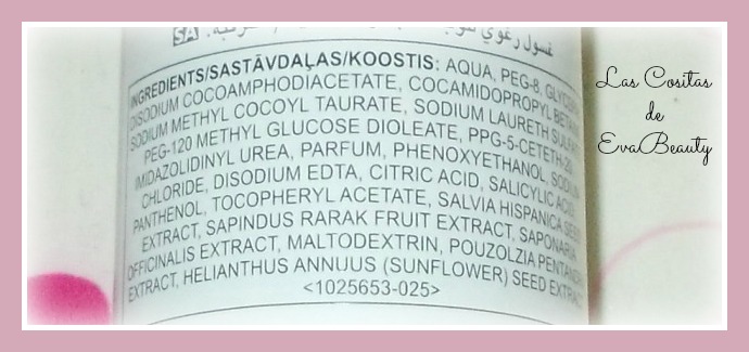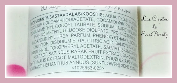 Bueno, lo primero que destaco es su olor, como no Eva y los olores!!!! jajaja, pues sí, para mí los olores son importantes también y tiene un olor suave, delicado, huele como a limpio y a la vez un toque floral, me fascina el olor y se me hace muy agradable cuando la utilizo.
