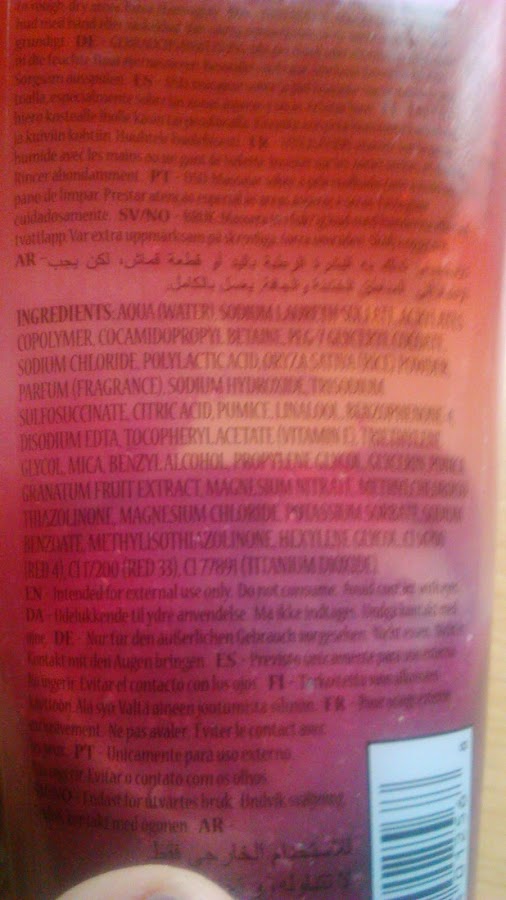 Sabéis de mi afán por los exfoliantes corporales, me gustan con mucho gránulo y que sea pequeño. Cuando vi este en uno de mis pedidos a maquillalia, me decidí a pedirlo. Me llamó la atención el hecho de que sea una marca novedosa para mi, que fuese iluminador y que su olor sea granada y frambuesa.Es un gel no muy denso, de color rojo con destellitos y, desafortunadamente, muy muy poco gránulo.