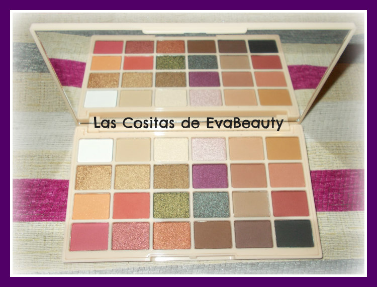 Tiene un espejo grande en el frontal de la paleta y contiene 24 sombras de ojos, con tonos muy variados y combinables, tanto en tonos mates como satinados.