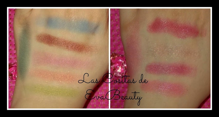 Como hay muchas sombras y brillos, hacer los swatches de todo sería muy largo, así que he escogido 5 sombras y 5 brillos para que veáis como pigmentan y los colores.