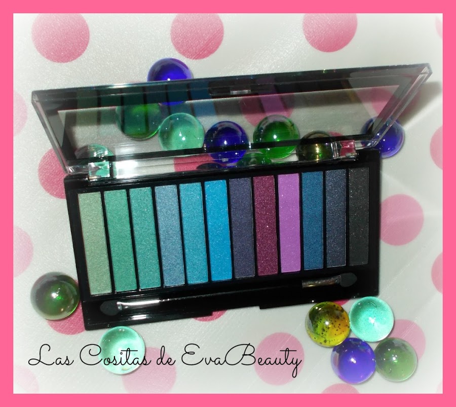Es una paleta que se presenta en packaging de plástico sencillo, y que contiene 12 sombras, entre satinadas y con purpurina.