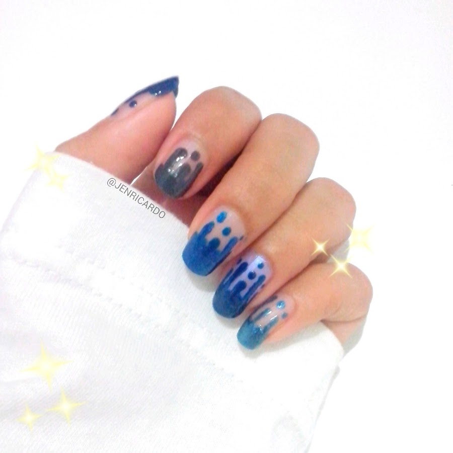 Puedes elegir los colores que tu quieras, yo utilice varios azules debido a que no me pude decidir solo por uno y el tecno es el que uso de fondo para mi dedo anular, si quieres les puedes dar una capa de brillo al final.