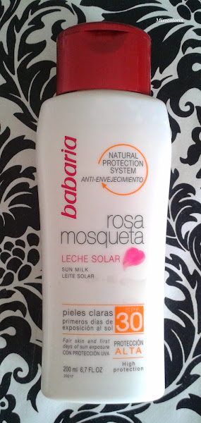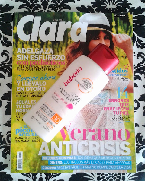 Cuesta 2´50? y regala un producto solar de Babaria. De los que tenía para escoger, me quedé con la leche solar con spf 30 con rosa mosqueta, especial para pieles claras. La verdad es que iba buscando otro producto similar con spf 40 pero no quedaba ninguno, y del resto de productos, a este es al que voy a sacarle más partido. El mes pasado compré otra revista que también traía productos de la misma casa, y elegí un protector solar para el cabello, así que ya me he hecho con un par de "solares" para reponer.