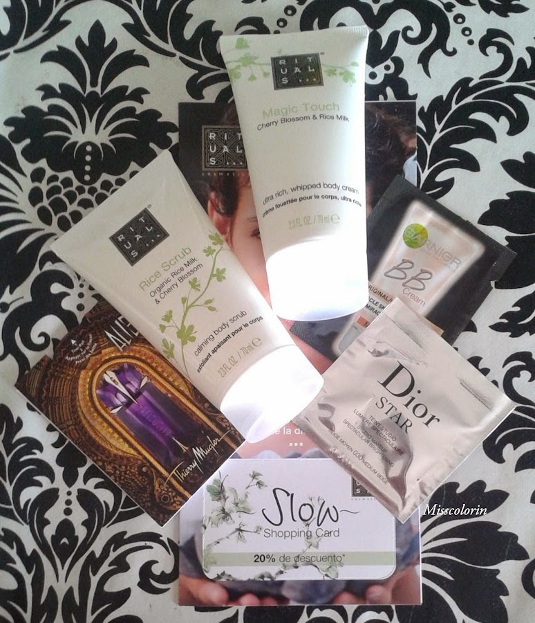 Obsequios: Loción corporal y Exfoliante de Rituals, ambos de 70ml (sé que en otras ciudades venía con el exfoliante solo, pero de 150ml). Además, incluye una tarjeta con descuento en la marca.