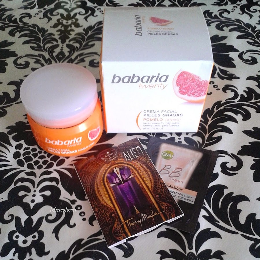 Obsequio: hidratante facial de Babaria (linea twenty). La hay en dos versiones, la de pieles secas y la de pieles grasas (con extracto de pomelo), que es la que elegí yo. Está indicada para pieles jóvenes (hasta 30 años, aproximadamente). El formato es original, de 50ml. De momento no la quiero abrir, pero ya he oído opiniones de otras chicas y se dice que es ligerita y de rápida absorción.