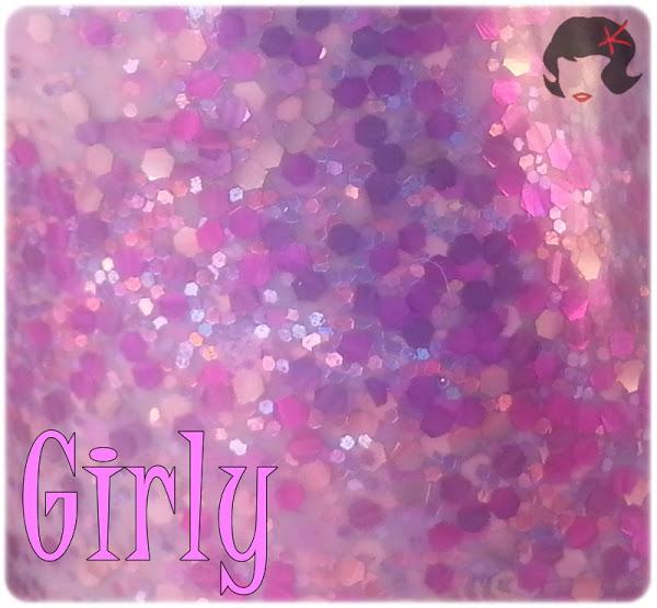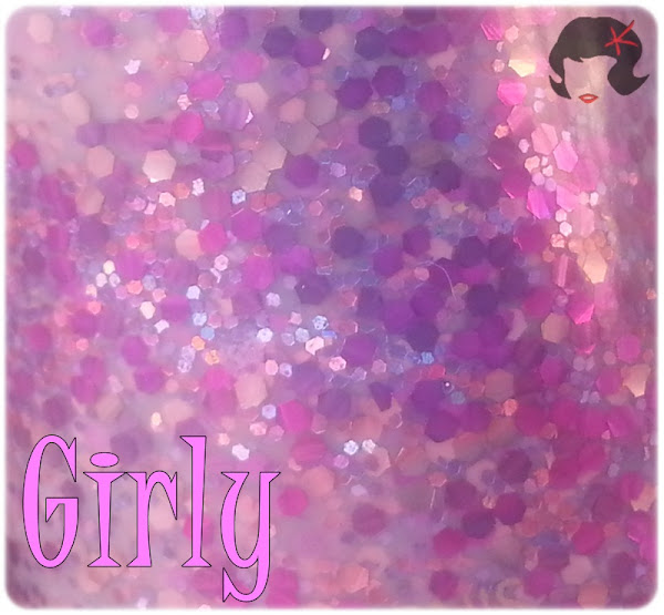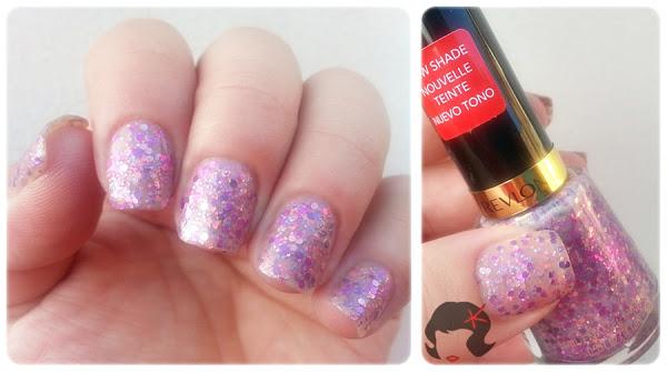 Es de una base lila con glitters hexagonales de dos tamaños, de distintas tonalidades, en la gama de los rosas y lilas.