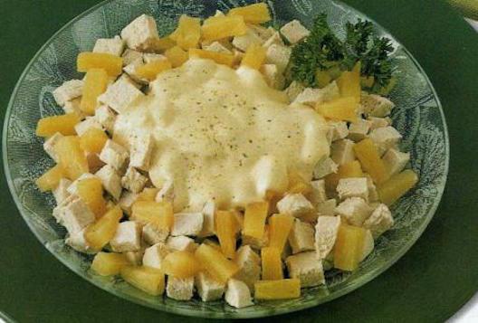 Hervir las pechugas en agua con sal. Luego picar tanto el pollo como la piña en forma de dados. Picar el perejil finito y mezclar todo.