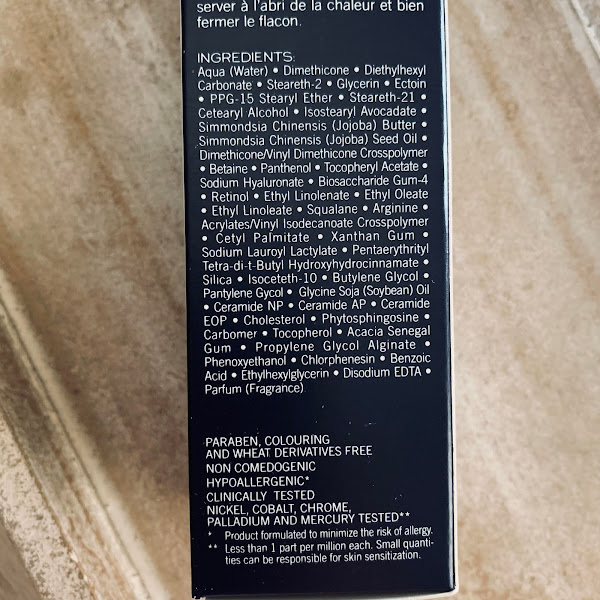 Aqua (Water) • Dimethicone • Diethylhexyl Carbonate • Steareth-2 • Glycerin • Ectoin • PPG-15 Stearyl Ether • Steareth-21 • Cetearyl Alcohol • Isostearyl Avocadate • Simmondsia Chinensis (Jojoba) Butter • Simmondsia Chinensis (Jojoba) Seed Oil • Dimethicone/Vinyl Dimethicone Crosspolymer • Betaine • Panthenol • Tocopheryl Acetate • Sodium Hyaluronate • Biosaccharide Gum-4 • Retinol • Ethyl Linolenate • Ethyl Oleate • Ethyl Linoleate • Squalane • Arginine • Acrylates/Vinyl Isodecanoate Crosspolymer • Cetyl Palmitate • Xanthan Gum • Sodium Lauroyl Lactylate • Pentaerythrityl Tetra-di-t-Butyl Hydroxyhydrocinnamate • Silica • Isoceteth-10 • Butylene Glycol • Pantylene Gycol • Glycine Soja (Soybean) Oil • Ceramide NP • Ceramide AP • Ceramide EOP • Cholesterol • Phytosphingosine • Carbomer • Tocopherol • Acacia Senegal Gum • Propylene Glycol Alginate • Phenoxyethanol • Chlorphenesin • Benzoic Acid • Ethylhexylglycerin • Disodium EDTA • Parfum (Fragrance).