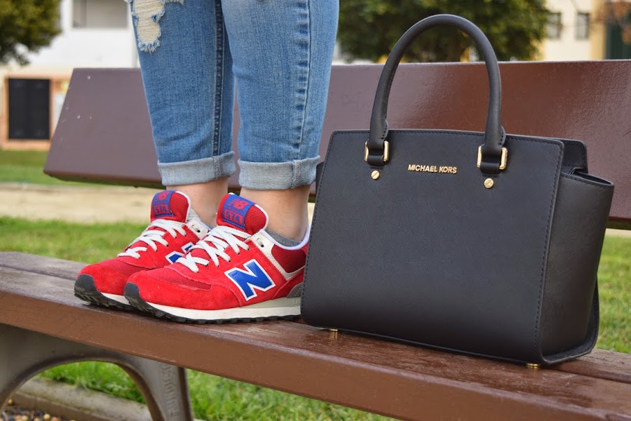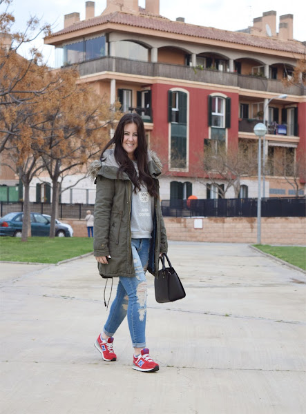 Good morning! Today I will show you a coooomfy look, sometimes I like to wear something simple, without complications and specially, comfortable. This time I used jeans with tears, a sweatshirt with message, my red new balance and my green coat that I have since years but I love it, specially when it"s cold or rain. As you can see, I return to show you my new bag, I love it and I think I will use a lot because it combines with all. I hope you like it and HAPPY THURSDAY!