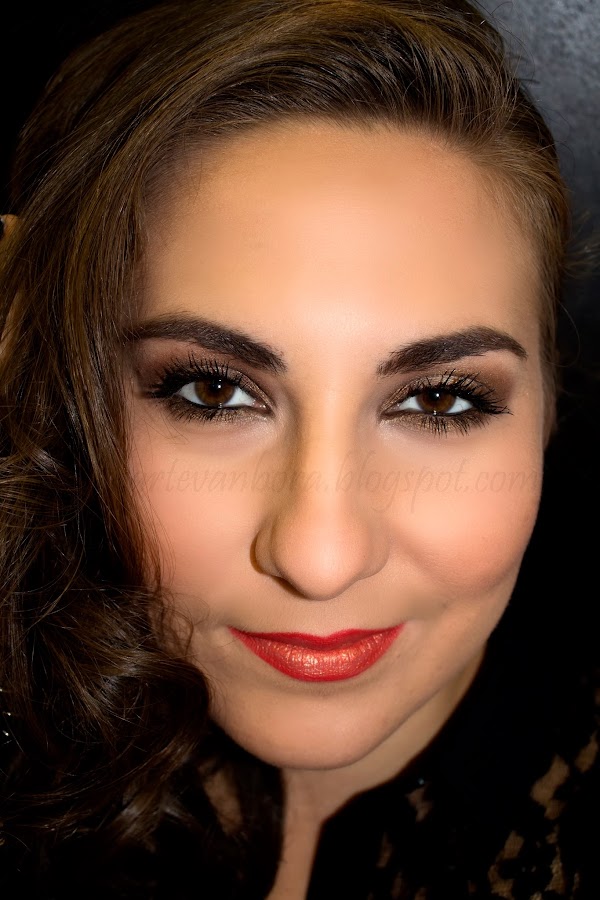 Los labios en tonos sorprendentemente profundos, naranja escarchado y tono desnudo cremoso y por supuesto el rojo obra de Rihanna y M.A.C ( Riri Woo), el LipGlass a juego del labial deja un aspecto de diamante.