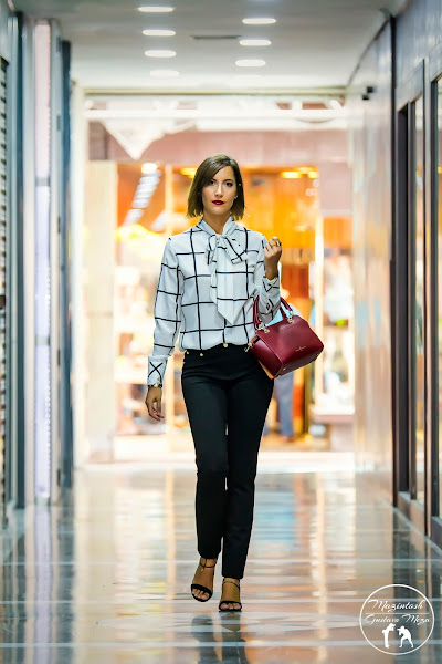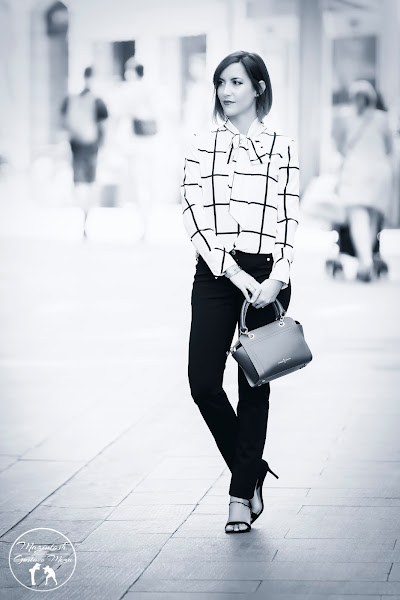 La blusa, con un estampado de cuadros/rayas en blanco y negro, es muy combinable. Además, el toque de la lazada en el cuello ayuda a dar más feminidad a un look a priori muy sobrio. ¡Me encantaría llevarla también con una falda lápiz!