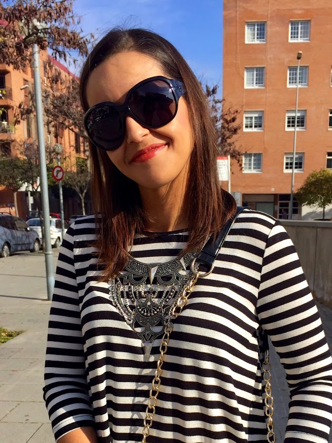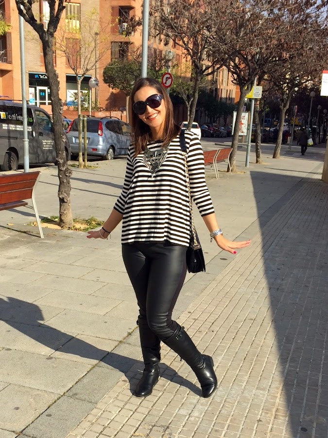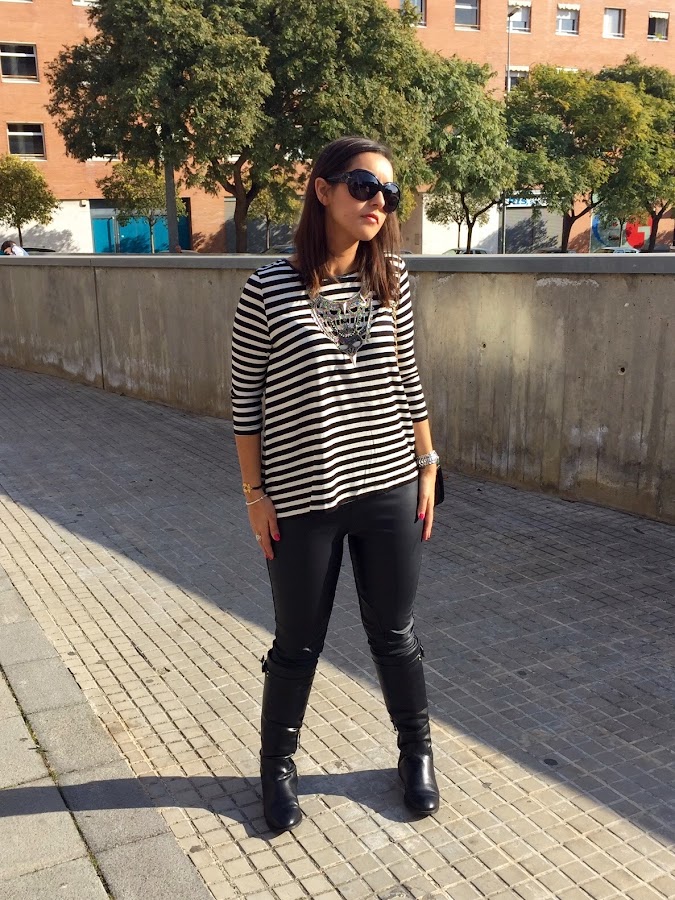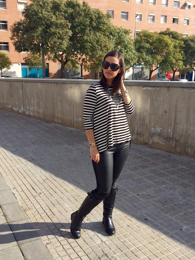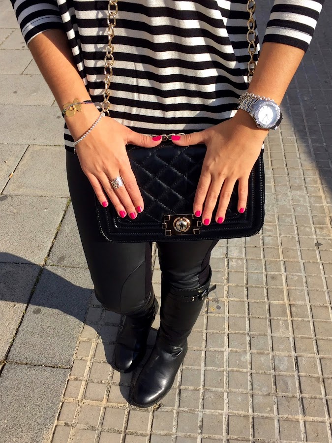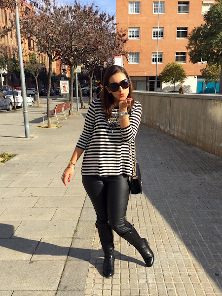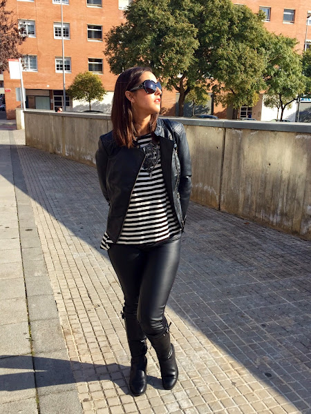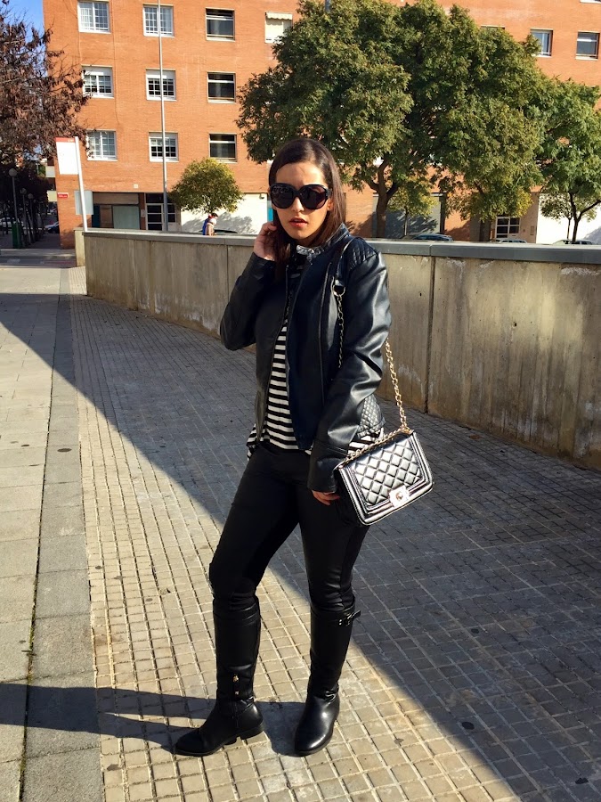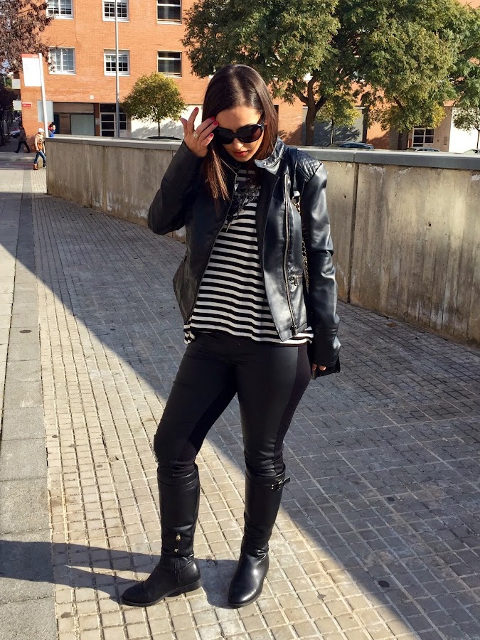 !Buenas noches bombones! Último post de la semana con un look muy rockero, perfecto para el fin de semana. En el look de hoy, llevo camiseta de rayas, leggings combinados en piel y mi biker negra. Los accesorios del look, mi collar favorito, mi bolso estilo Chanel y botas negras.