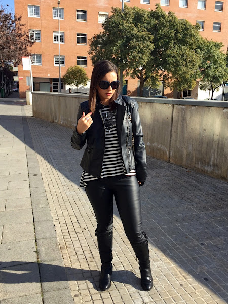 ¿Qué os parece el look de hoy? Gracias por vuestras visitas y comentarios. Feliz fin de semana.Good night babies! Last post of the week with a rock outfit, that it"s perfect for wear at the weekend. In the outfit of the day, I wore a navy tee, leather leggings and my black leather jacket. The accessories of the outfit were my favourite necklace, my bag imitation of Chanel and black boots.