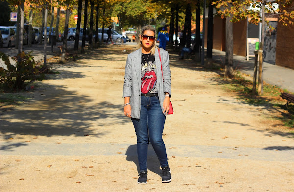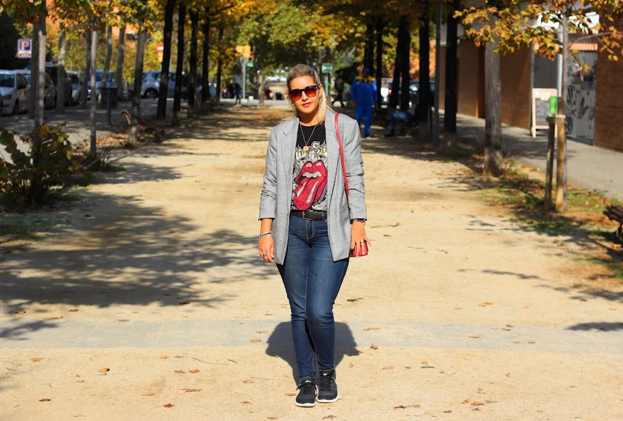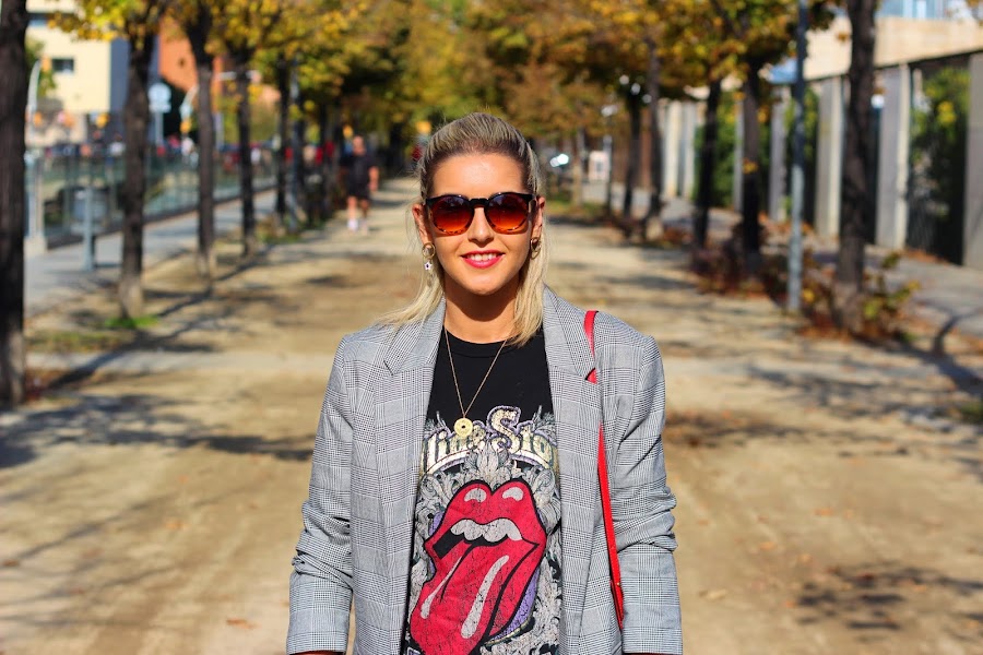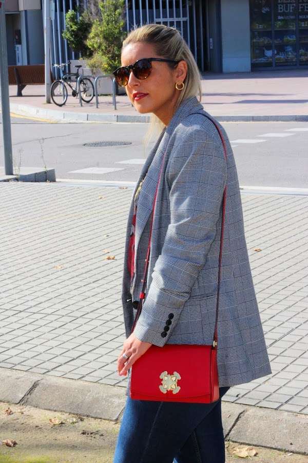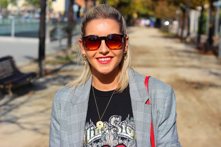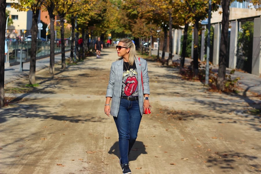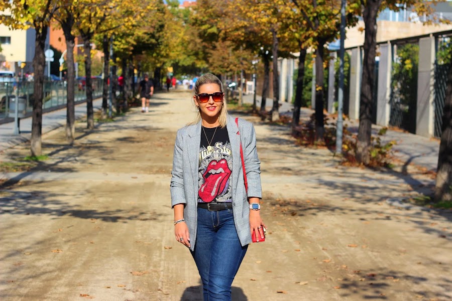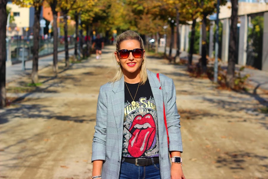Today I show you a casual chic outfit that I think its perfect to wear during the weekend. In the outfit of the day, I wear a rock tee with a jeans and a checked jacket. The accessories of the outfit are black sneakers and to give a touch of color to the outfit, I add my red bag from Tous. A very comfy and chic outfit!