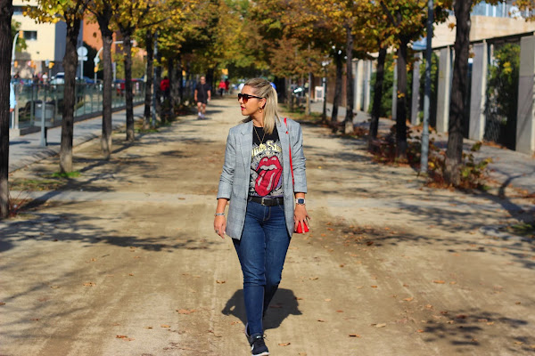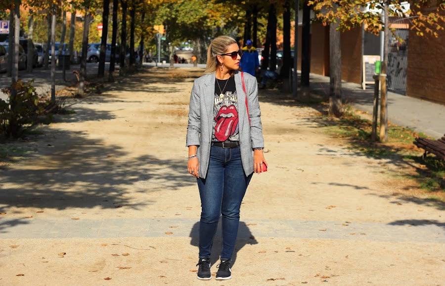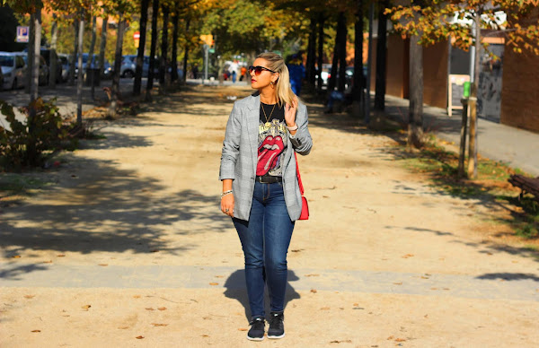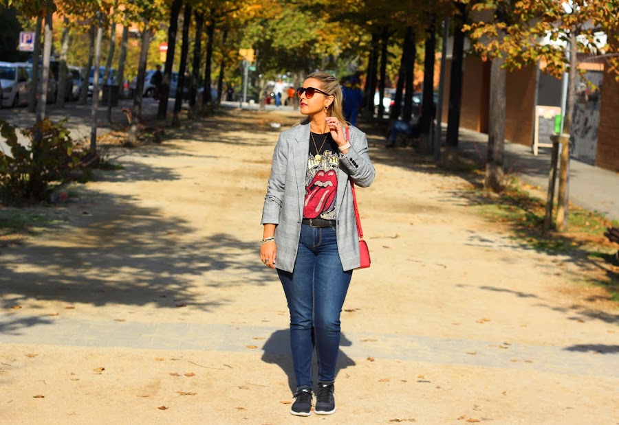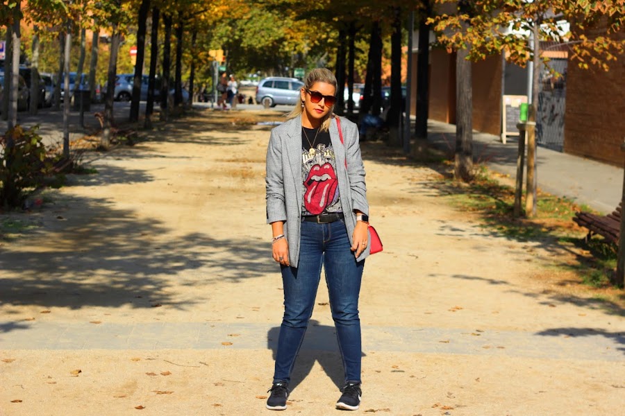 Hoy os traigo un look casual chic que me parece perfecto para llevar durante el fin de semana. En el look de hoy, llevo una camiseta rockera con unos jeans y una blazer de cuadros de principe de gales. Los accesorios que escogí fueron unas zapatillas de deporte y mi bolso rojo de Tous. Un look super cómodo y chic.