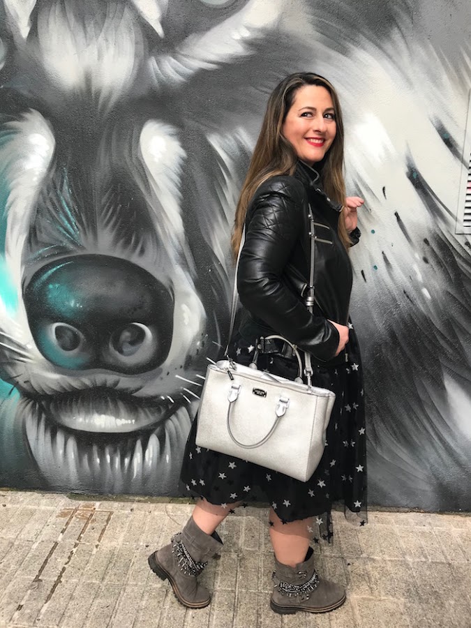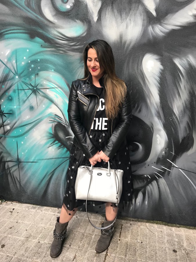 Empezamos por la falda, modo amor a primera vista nada mas entrar en la tienda, N de nube tiene prendas maravillosas que llaman la atención y ademas sientan de maravilla. Y aunque no había encontrado el momento de estrenarla, por fin he elegido el día y aquí esta el resultado. La combine con camiseta negra y biker de piel. Botas con tachas y bolso en color plata complementan el look.