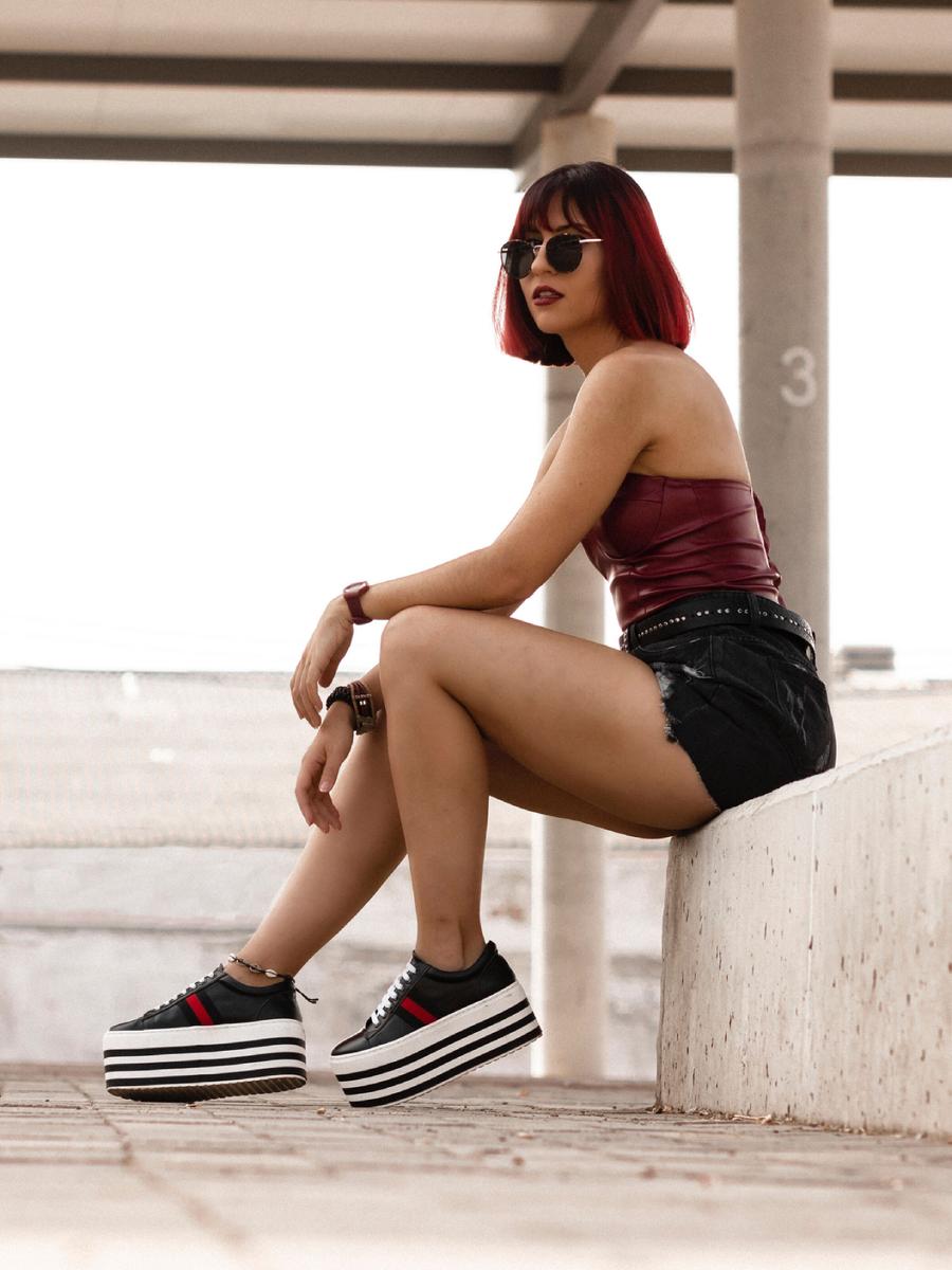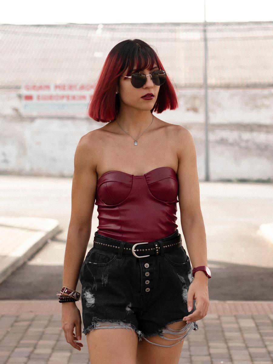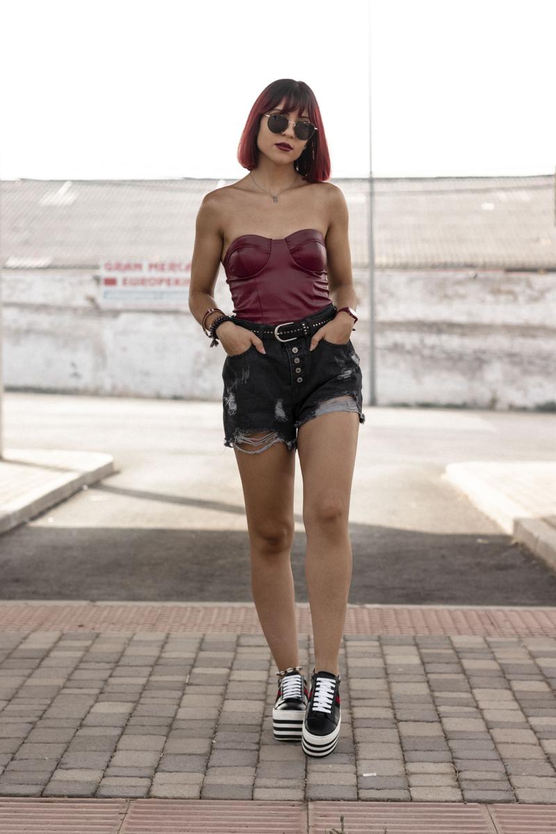 Y bueno, aquí os traigo un nuevo look con un top de cuero (mejor dicho, polipiel) de palabra de honor y unos shorts negros muy destroyer.