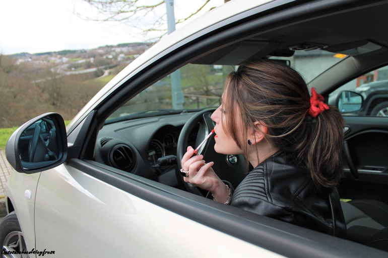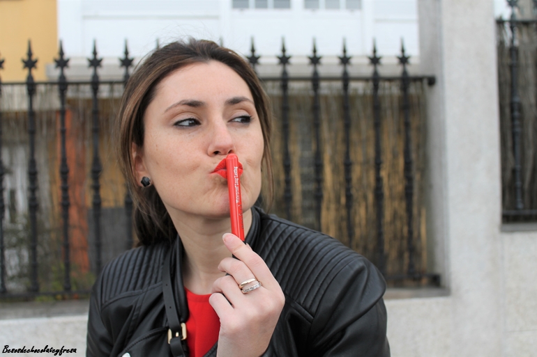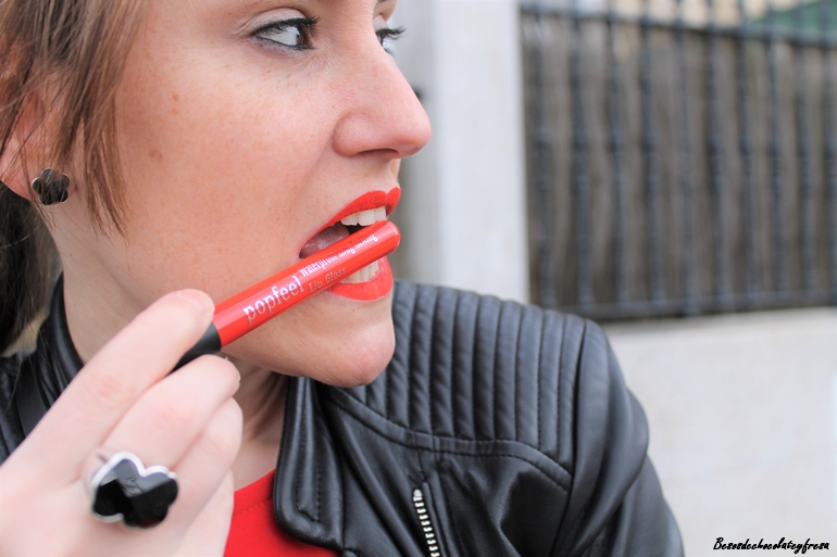 En cuanto a los labios os enseño uno de los labiales que os mostraba en el post de belleza de la semana pasada. Efecto duradero incluso después de comer, en el que se tiene que retocar muy muy poco, rojo pasión Nº08 de la firma Popfeel Cosmetics.
