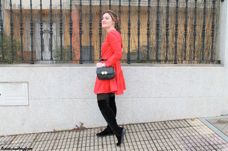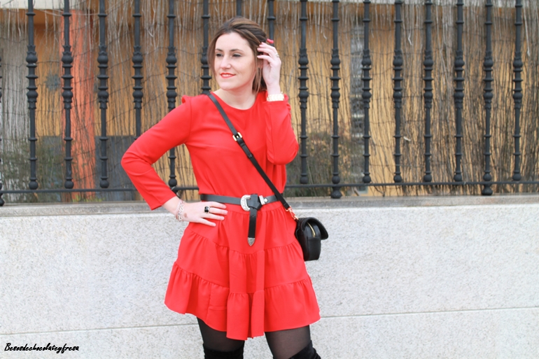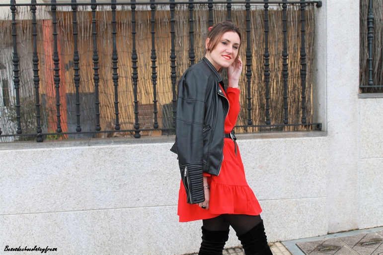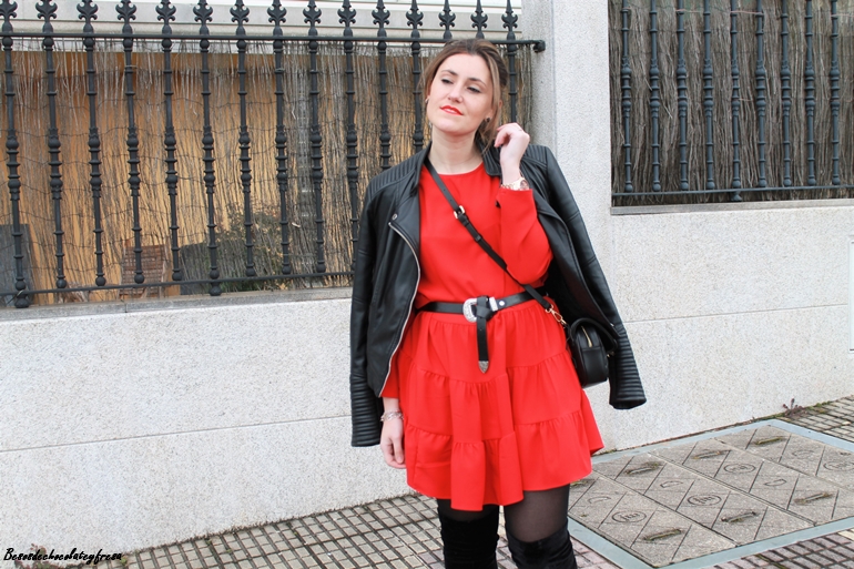 Para esta ocasión aposté por un vestido totalmente rojo con vuelo en la falda a modo de volantes. Un vestido sencillo pero con toques divertidos y sobre todo cómodo. Aposté por combinarlo con negro como las botas, biker y bolso bandolera.
