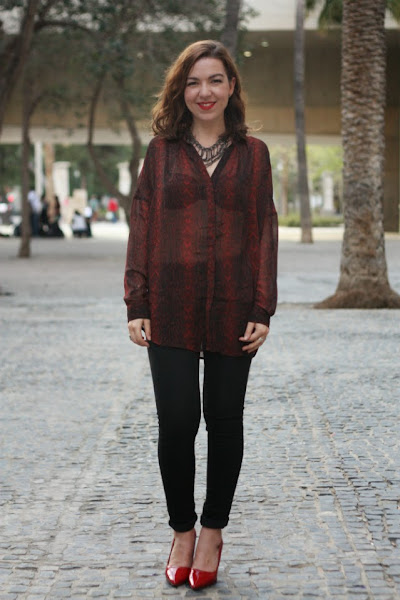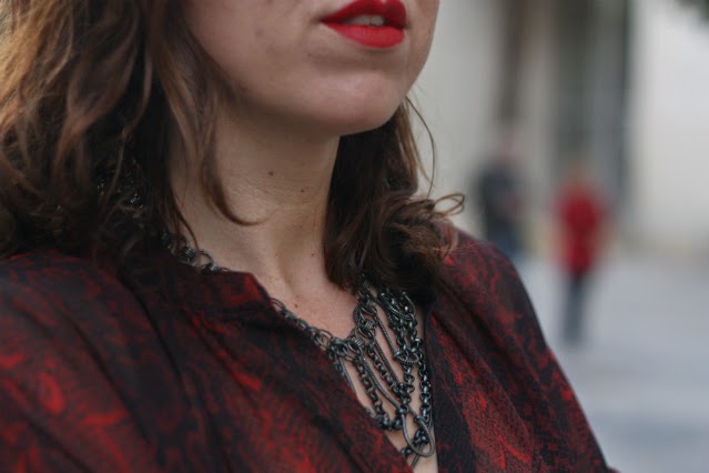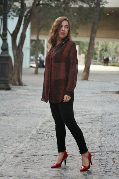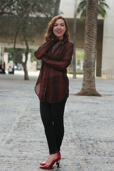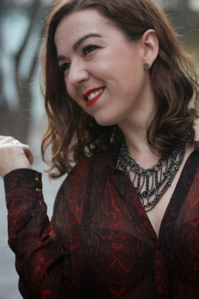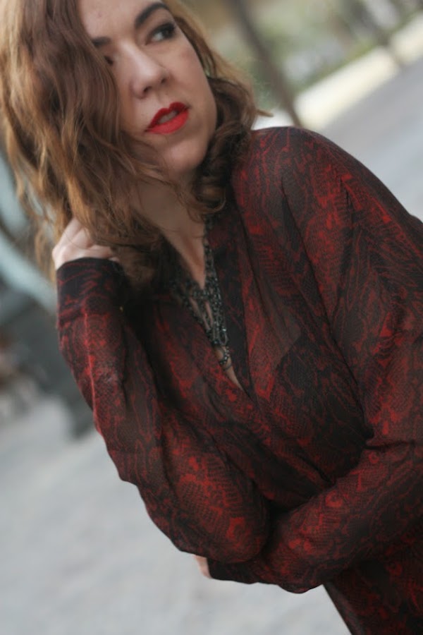 ¿no os pasa a veces que veis una prenda de ropa y pensáis en alguien? Una amiga me dijo que esa camisa me pegaba y la verdad es que al verla sabía que se venía conmigo a casa: semitransparente, animal print, over size y con un puntillo rockero que rematan los pantalones slim y... ¡de cintura alta! o normal! jeje para mi los pantalones más cómodos son los que llegan al ombligo más o menos, ni muy altos, ni muy bajitos y por fin empiezan a venderse en tiendas.Labios rojos (mi adorado Russian Red de MAC) stilettos rojos y un maxi collar para completar el look que elegí para salir de cena con amigos. Bueno, y una cazadora de cuero, que el tiempo está loco y un día hace calor y al día siguiente las temperaturas bajan y así ando, medio resfriada, solo espero no caer que la semana que viene el lunes es festivo en Valencia y no quiero pasármelo en cama.