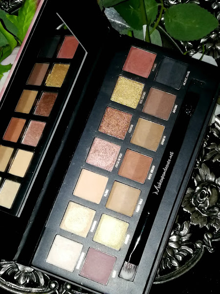 Contiene 14 sombras , la distribución es exactamente la misma que la de la paleta original . El packaging es de cartón, incluye un espejo y una brocha de dos extremos, por un lado lengua de gato y por el otro para difuminar. La de lengua de gato me parece muy dura y sintética pero la de difuminar me gusta. No es una brocha de alta gama pero para estar incluida dentro de una paleta no está mal .