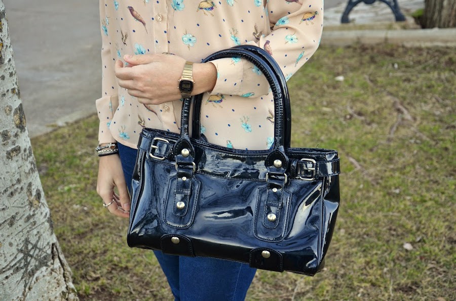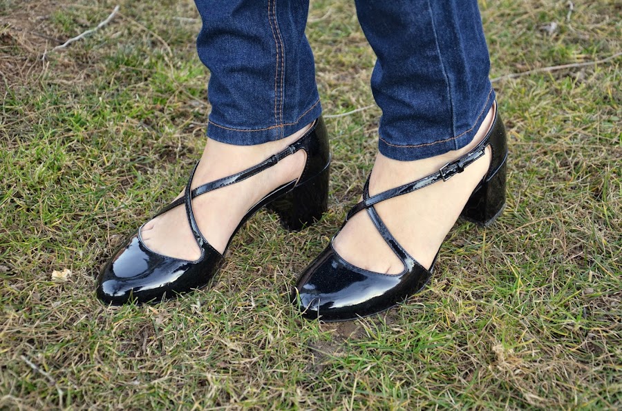 Para combinarla elegí complementos de charol negro. Los zapatos también son de estas rebajas y el bolso ya tiene unos cuantos años pero es que el charol nunca pasa de moda y a mi parecer siempre aporta un cierto aire elegante ya sea en looks arreglados o en looks mas casuales.