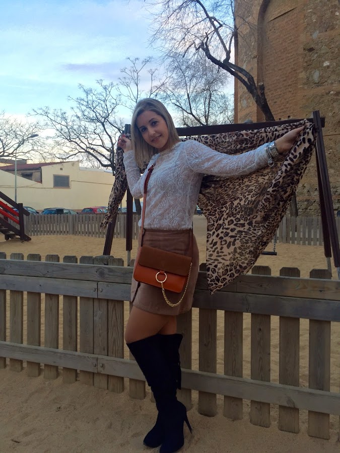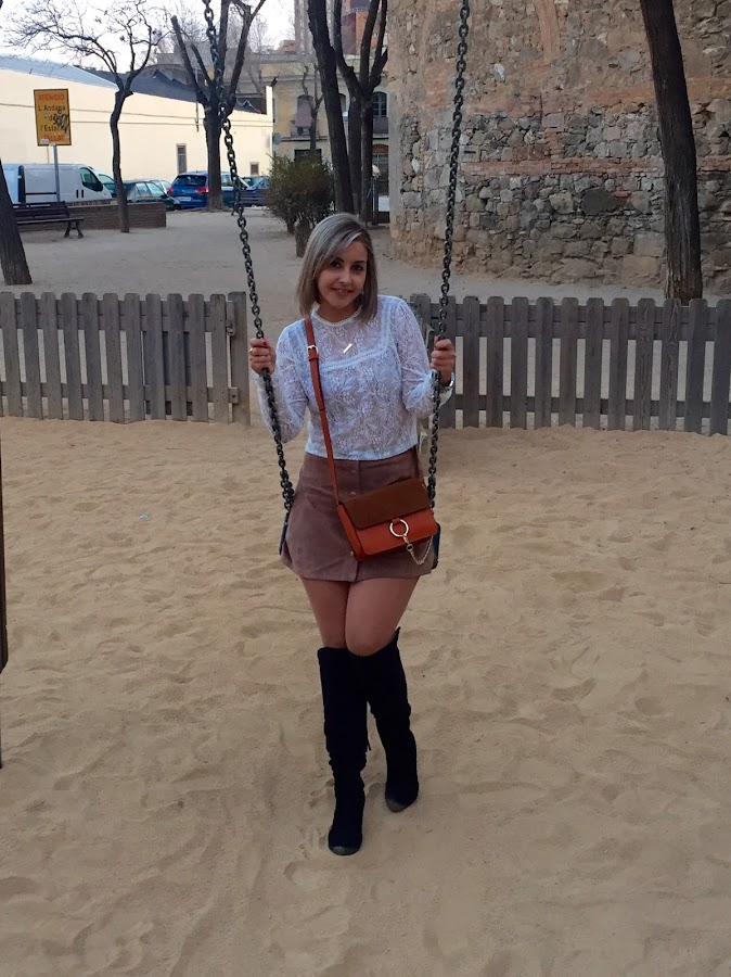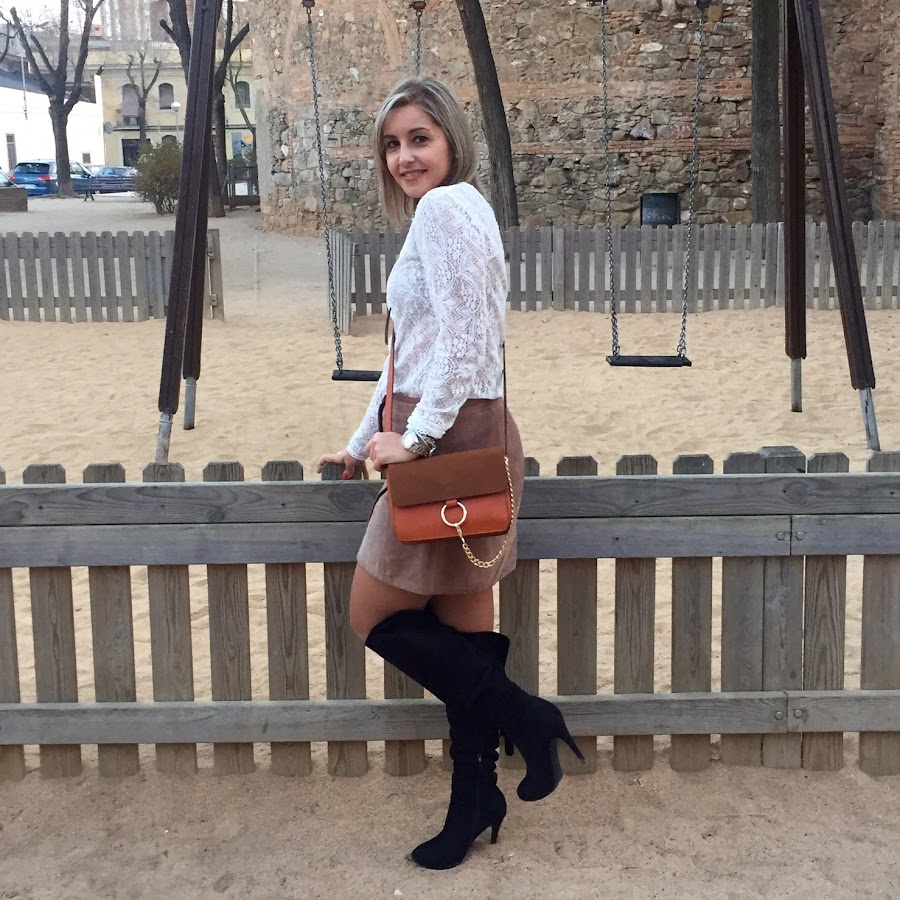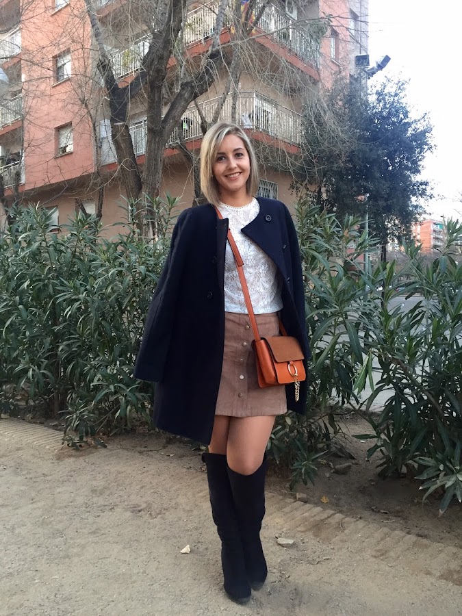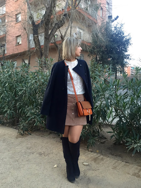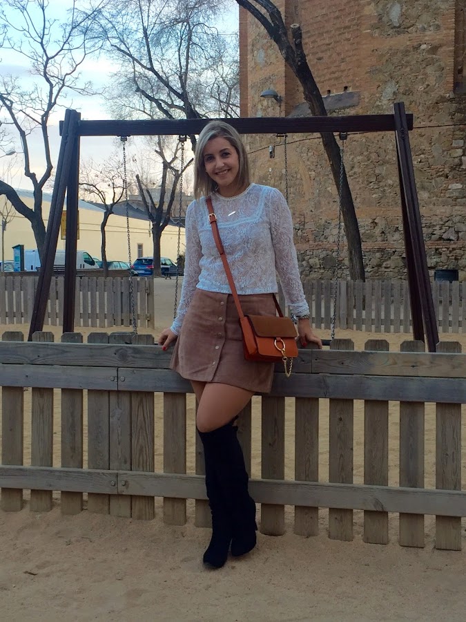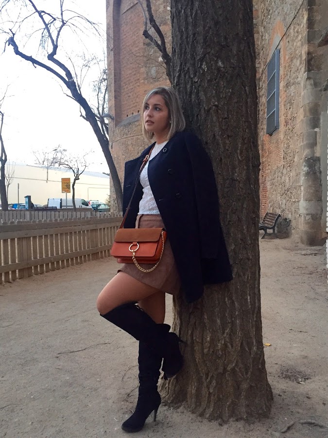 Today I show you the outfit that I wore to go to eat with my boyfriends family. I wanted to wear a feminine outfit and I chose a lace tee that I bought in the sales, because I think that this kind of tees gives a romantic and sweet touch to the outfit. I wore it with my suede skirt that I had showed you in the blog, my black boots over the knees, a black coat and my bag similar to Chloes bag.