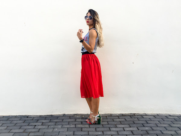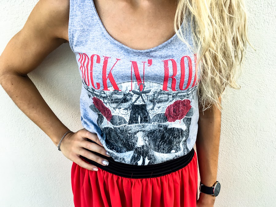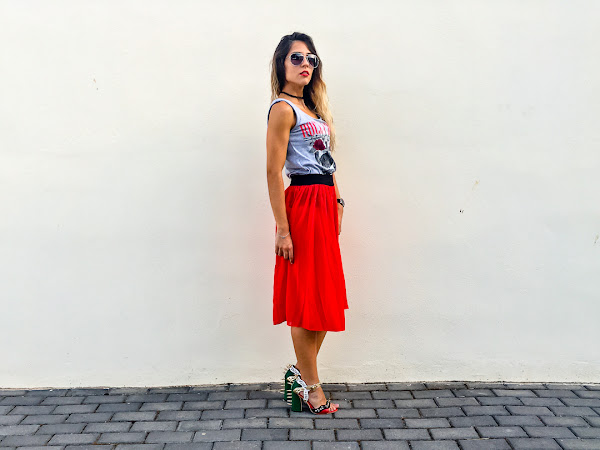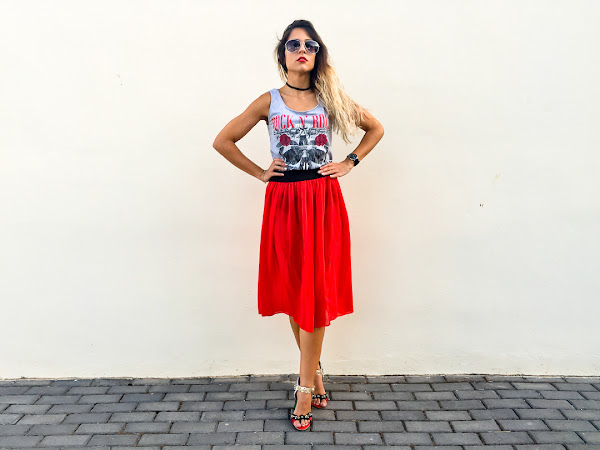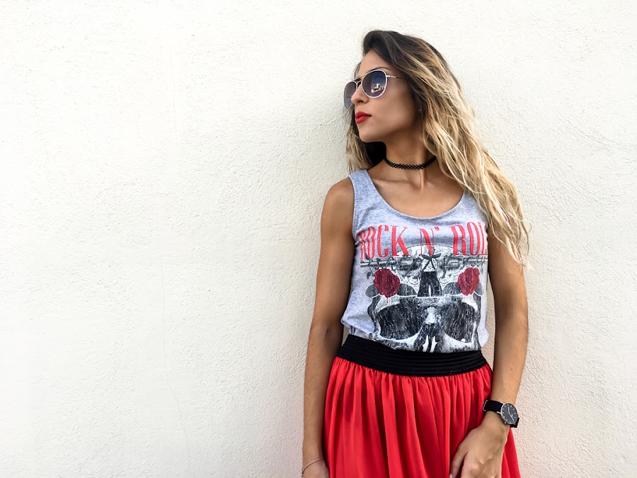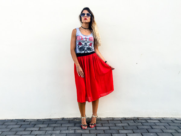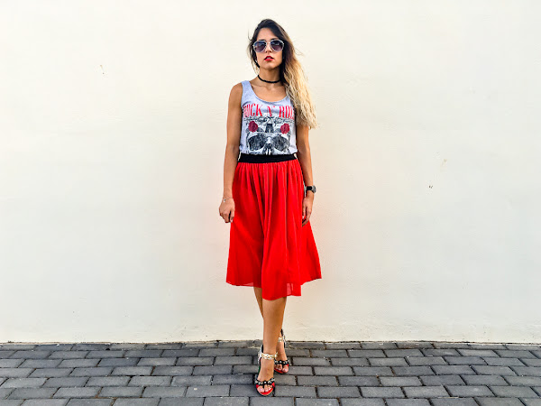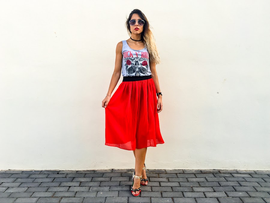 La he combinado con una falda de tul roja de YOINS y con mis sandalias más rockera de JESSICA BUURMAN!