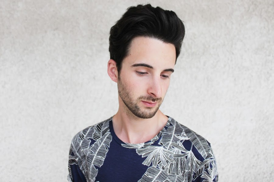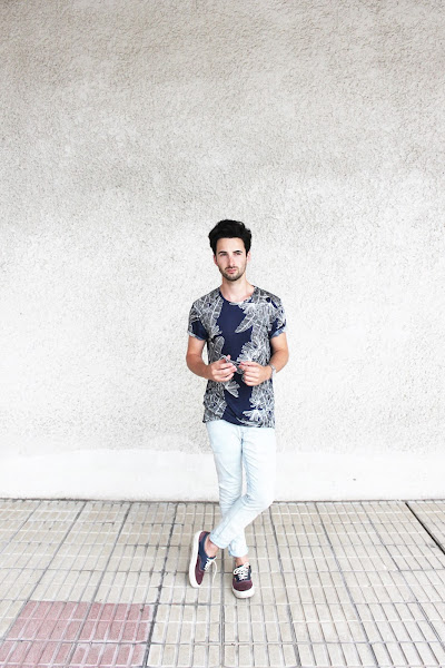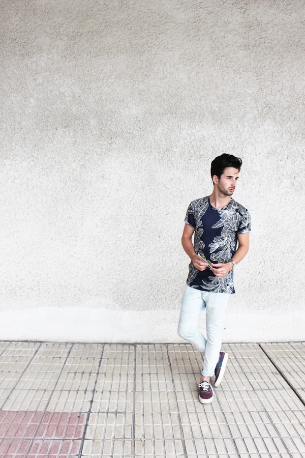 Dani adora también los estampados, los considera fundamentales y cree que aportan vida a los looks, los hace no aburridos. El mismo día que yo compré el mono, el compró esta camiseta. Este rollo de dibujos ilustrados y luego impresos sobre ropa, sobretodo con temas florales o vegetales, los vamos a encontrar por todas partes este verano, son bellos de estilo japonés sobre una base de color plano.