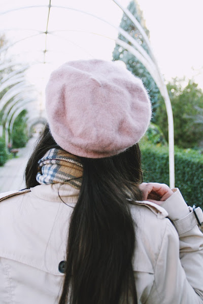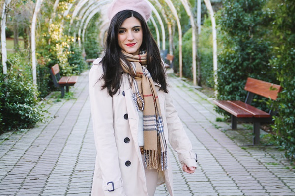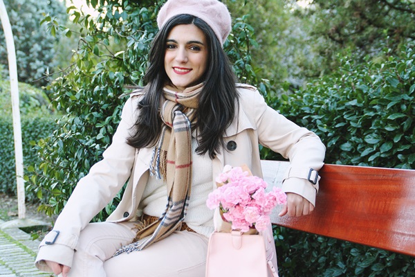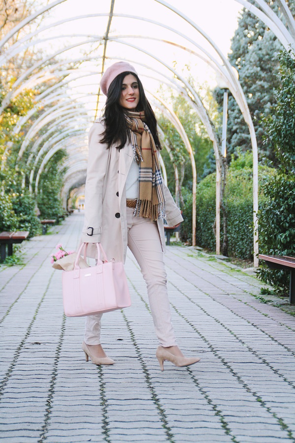 Los detalles consisten en una bufanda de cuadros estilo Burberry (which I love), una boina rosa muy naif y unos stilettos nude que también son los reyes de mi armario.