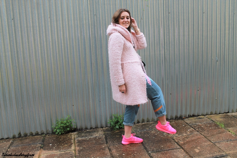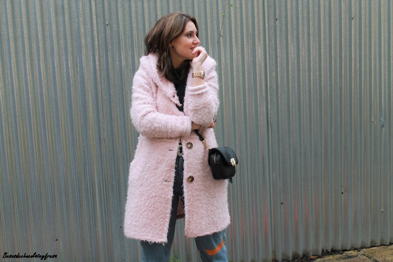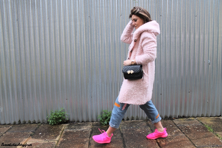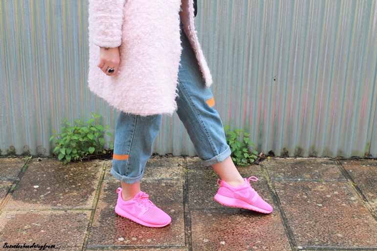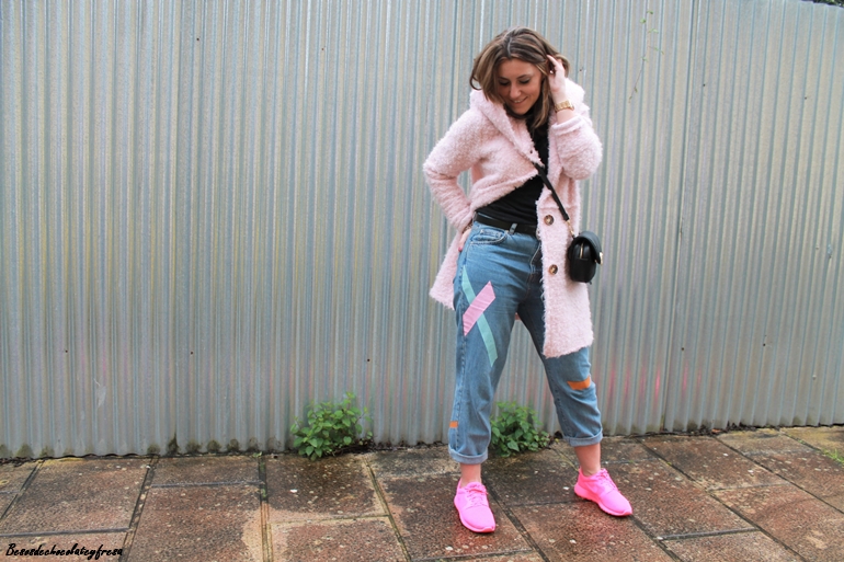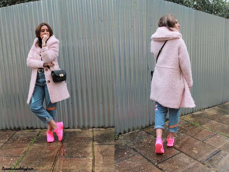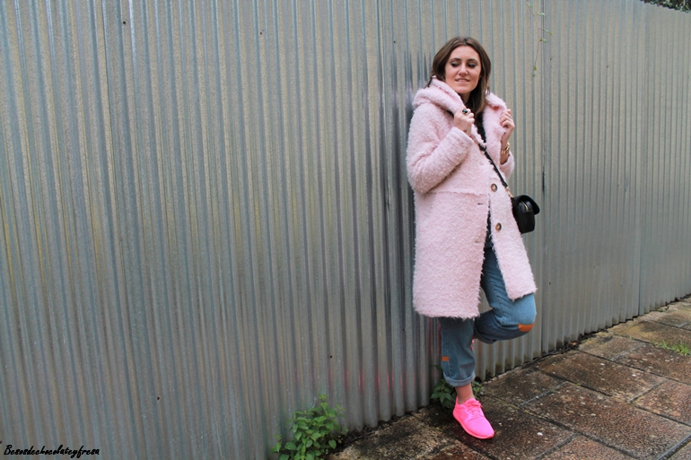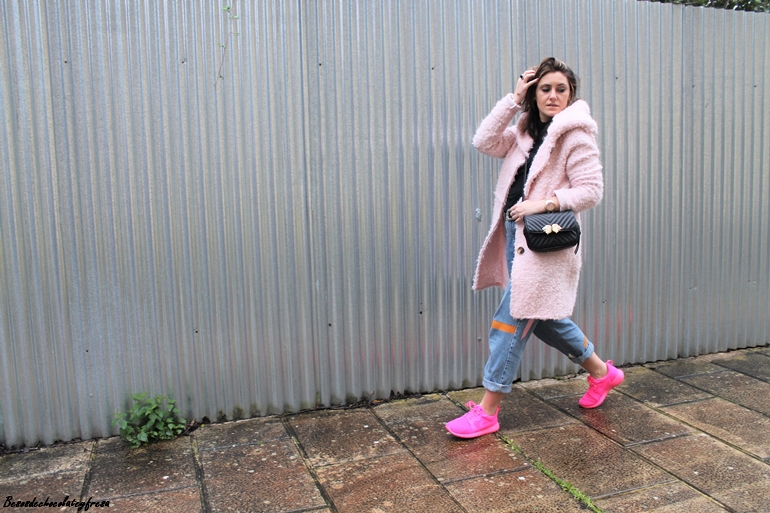 Para el look de hoy decidí unir estas dos tonalidades de rosa, rosa empolvado en el abrigo de borreguillo y las lineas pintadas de los mom jeans. Por otra parte rosa fucsia en las sneakers de Nike, que son hiper-mega-cómodas como si de unas zapatillas de andar por casa se tratasen.