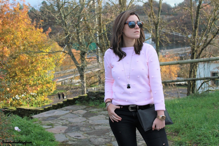 Lo llevo con jeans negros y cinturón tipo cowgirl, collar de oso Tous, sneakers blancas y bolso tipo clutch en el mismo color. Un look cómodo y abrigado a la vez que dulce.