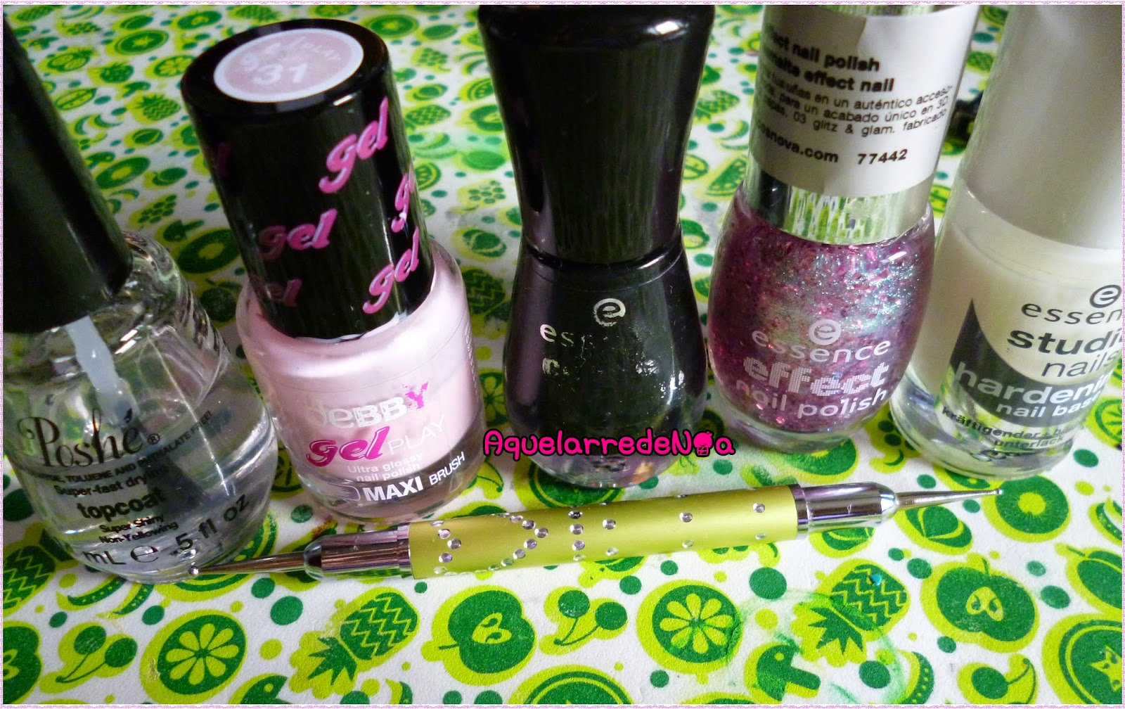 En el borde externo ponemos un poco del Glitz & Glam, un top lleno de brillis rosas. Una mano de poshé para terminar y lista nuestra mani discreta...(mas o menos claro jj) Según mi chico se parece a un liguero, aunque a mi mas me recuerda a un corset que tengo por ahi perdido.