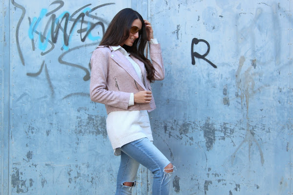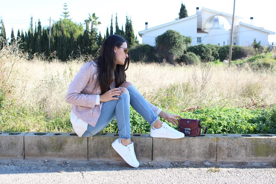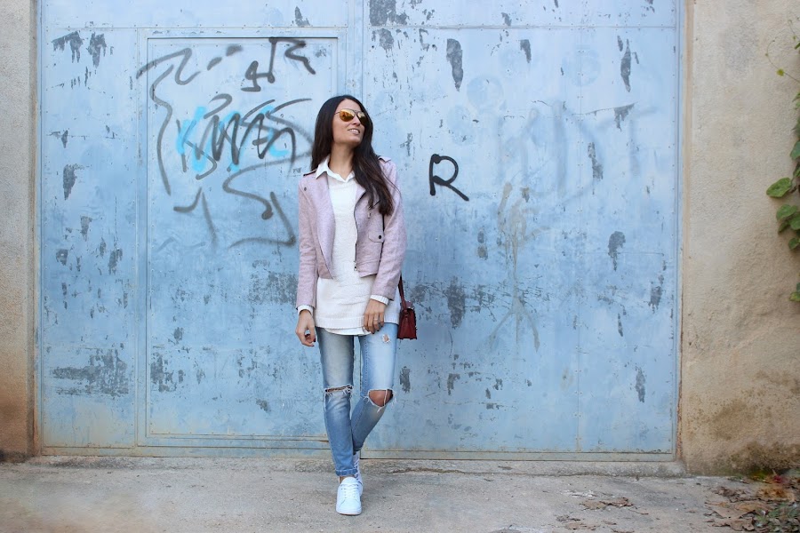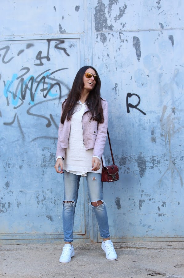 Esta vez estreno una preciosa cazadora de antelina rosa y unas ideales deportivas blancas!! Este estilo de deportiva además de ser comodísima es un clásico que no puede faltar en tu armario!! Junto unos destroyed jeans y un jersey básico blanco este es el resultado!