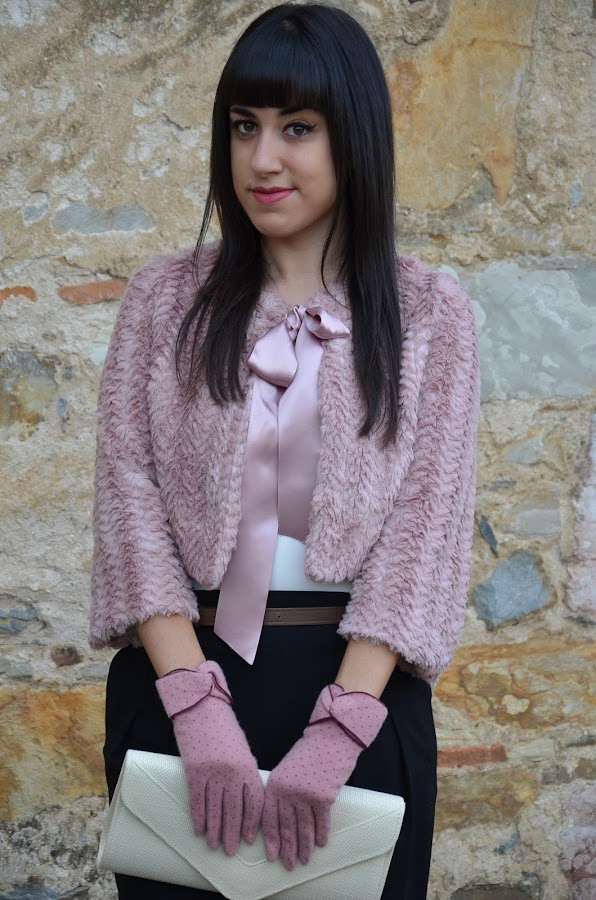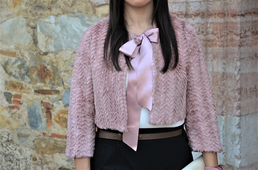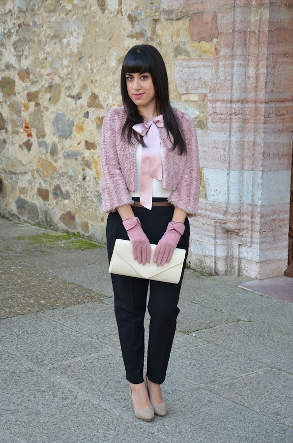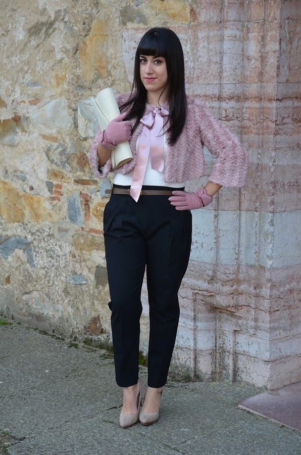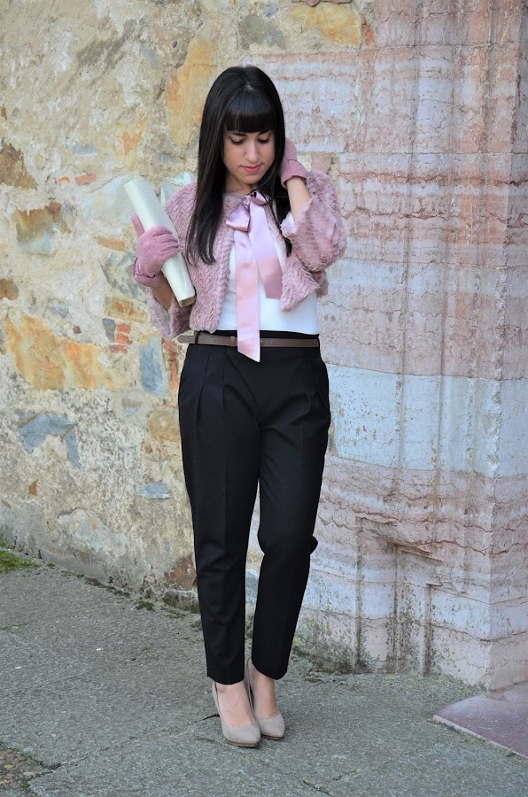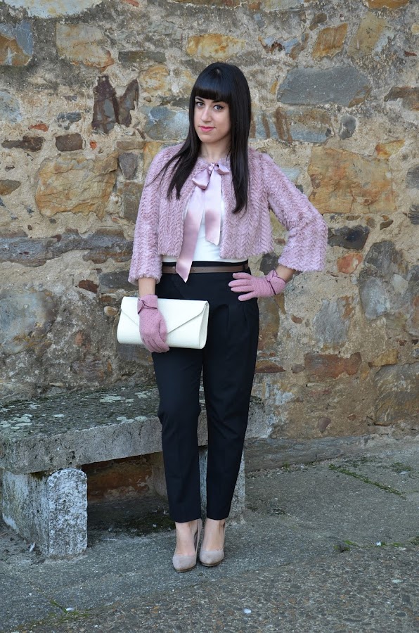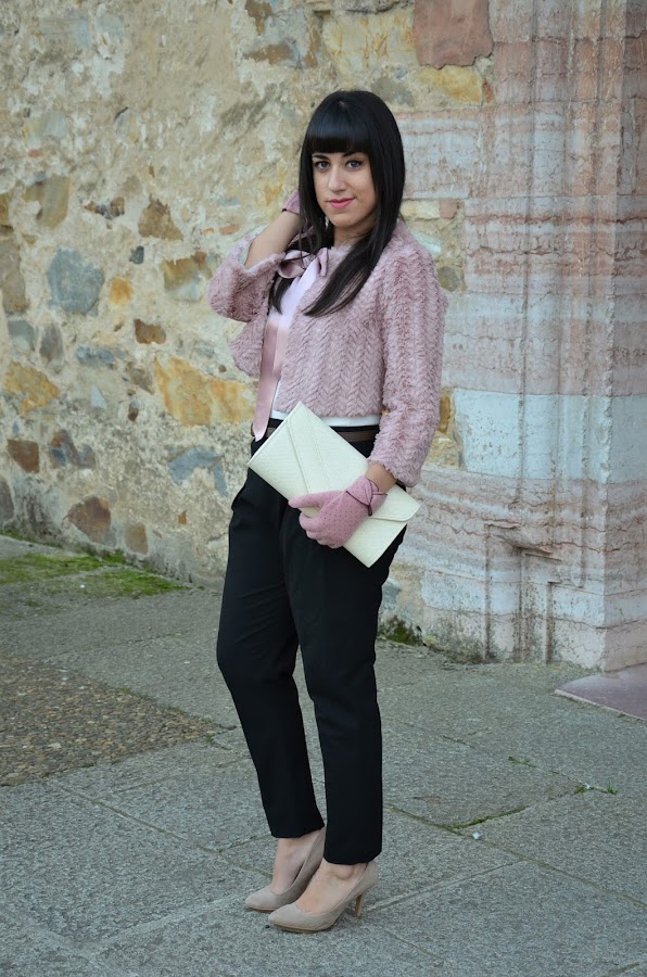 La indiscutible protagonista del outfit es la preciosa torera de pelo con lazada de Alma Coqueta. En color rosa y con tacto super suave es una prenda ideal para looks arreglados, ya sea con vestidos y faldas o con pantalón, como es el caso de la propuesta que hoy os traigo (aunque queda pendiente de enseñaros una combinación con vestido).