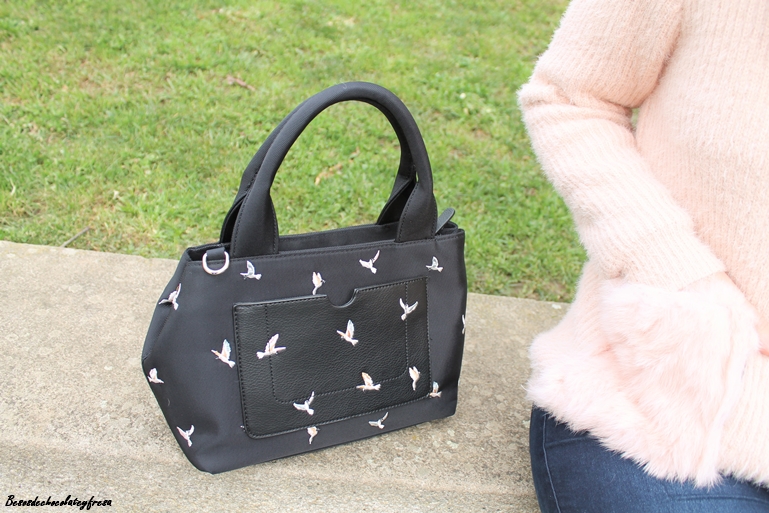 También os enseño mi nuevo bolso, regalo de amigo invisible de una persona muy especial en mi vida, en tonos negros con estampado de palomas para llevar tanto de mano como bandolera con correa extraible.