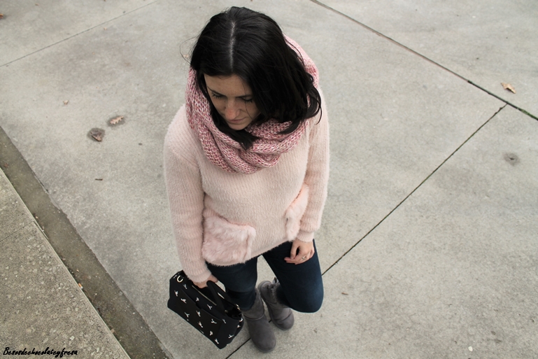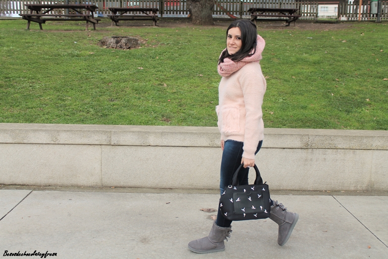 Completo el look con jeans oscuros, botas grises Ugg también regalo de las Navidades y bufanda en tonos rosas de punto y con capucha que ya os había enseñado en estos posts. Aquí, Aquí y Aquí ¿qué os parece?