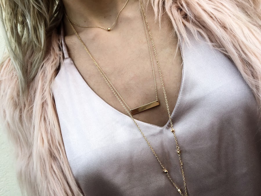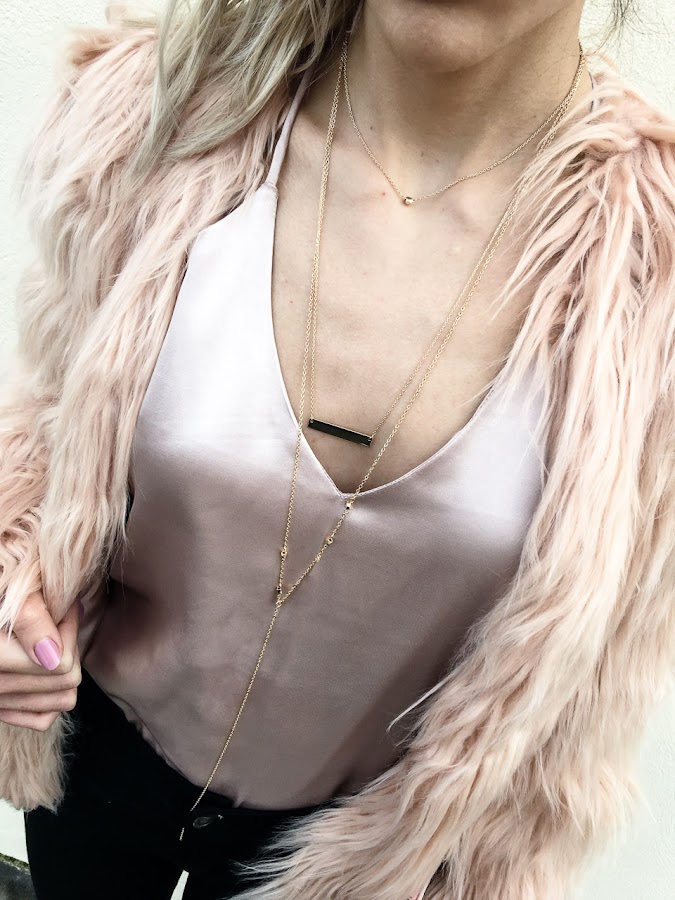 Lo he combinado con un top de raso de estilo lencero en un tono rosa, un pantalón negro y un clutch muy molón! Para mis pies he elegido mis botines de hebillas y como complementos unos collares preciosos, todo un detallazo!