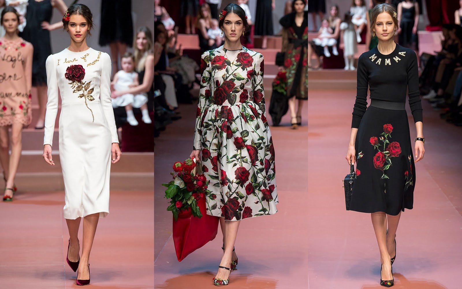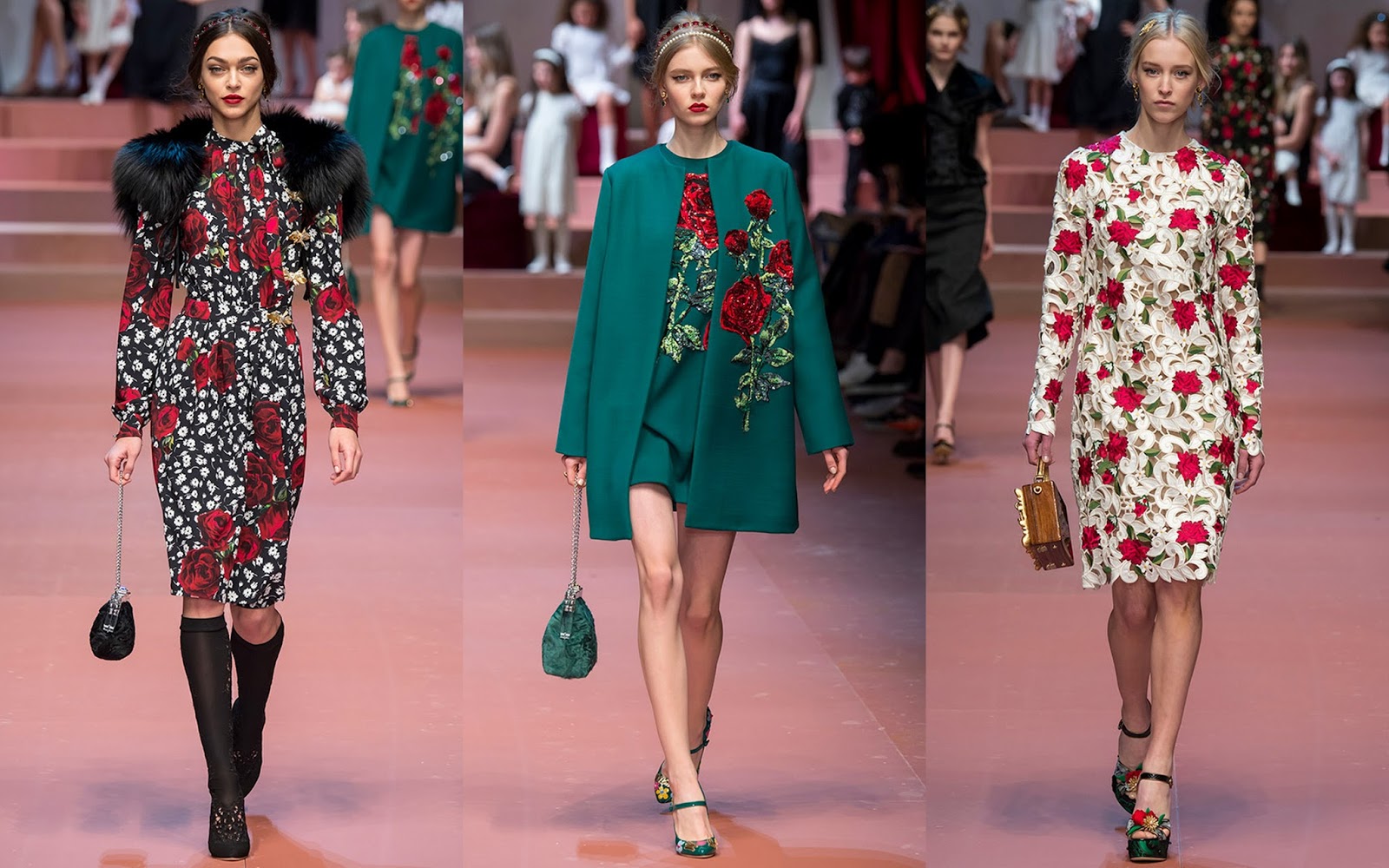 El color rojo tiene un papel predominante en la colección otoño-invierno 2015-16 de Dolce and Gabbana. Los diseñadores toman las rosas rojas como protagosnitas de sus prendas, grandes flores bordadas salpican su colección para esta temporada.