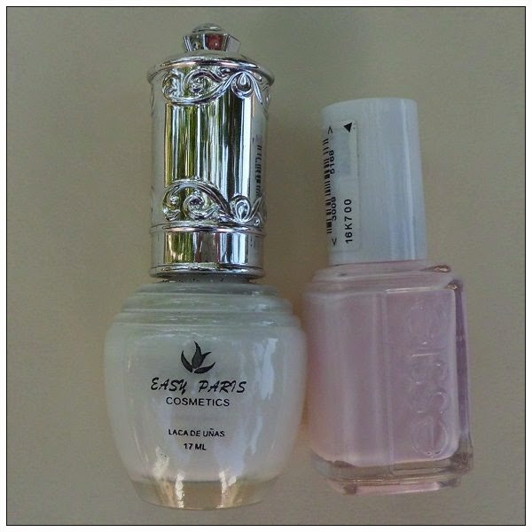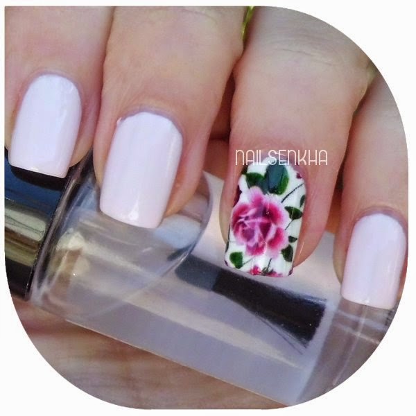 *Luego pinto de blanco la uña en la que voy a poner la pegatina y luego las otras con el Essie Fiji, que es un rosa muy clarito precioso.