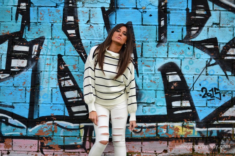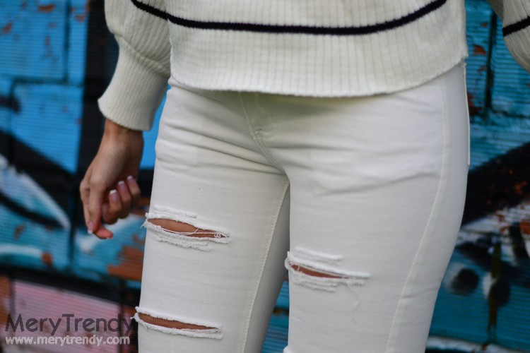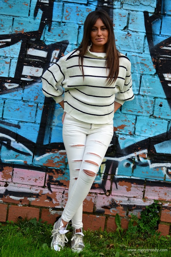 Hoy os acerco otro Total Look low cost por menos de 50 Euros (cuyos items podéis adquirir online juntos o por separado), compuesto por 2 prendas de Romwe (jersey de rayas + skinny jeans con rotos) y unas bambas plateadas de Motufashion.