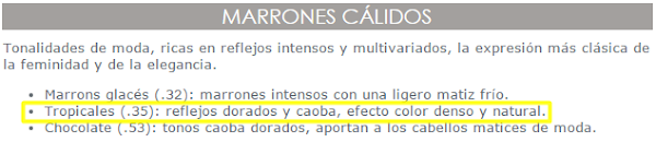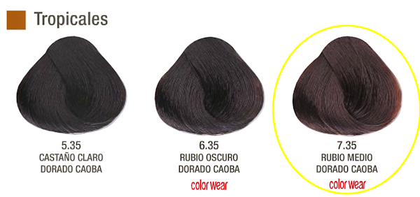 En esta ocasión me decidí por la línea de color permanente Evolution de la marca italiana Alfaparf Milano . El tono escogido está en la gama de los Marrones cálidos y es el 7.35: Rubio Medio Dorado Caoba