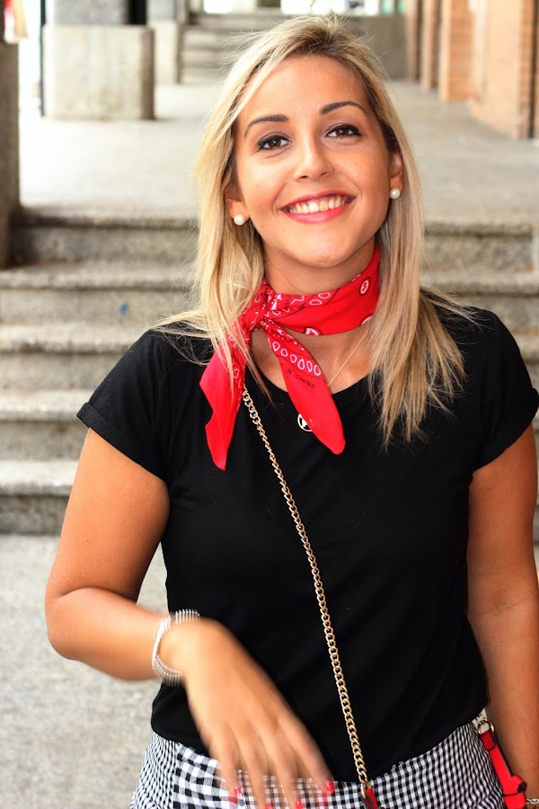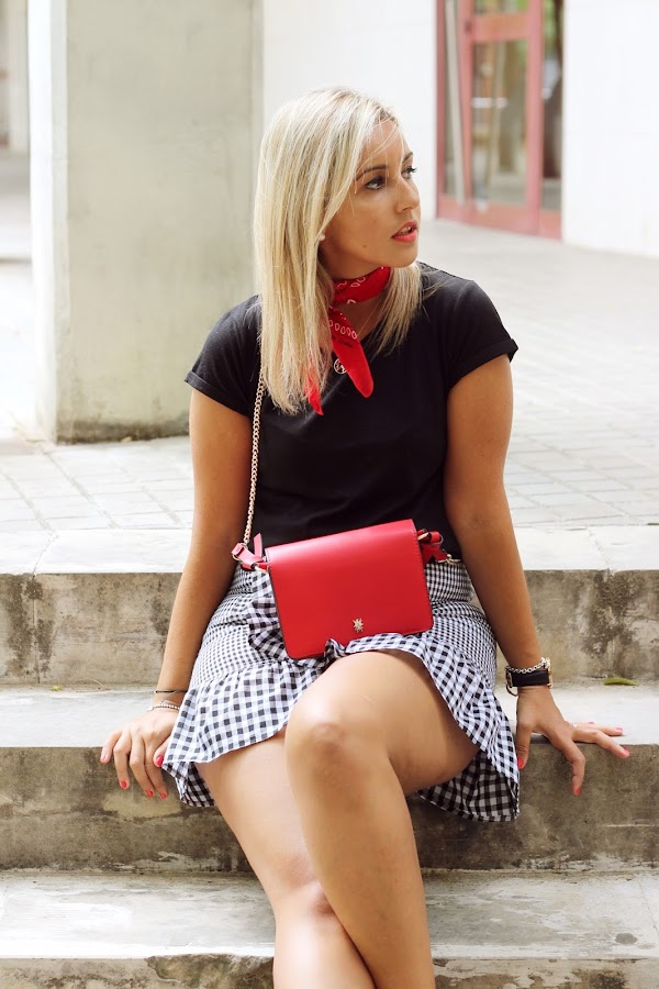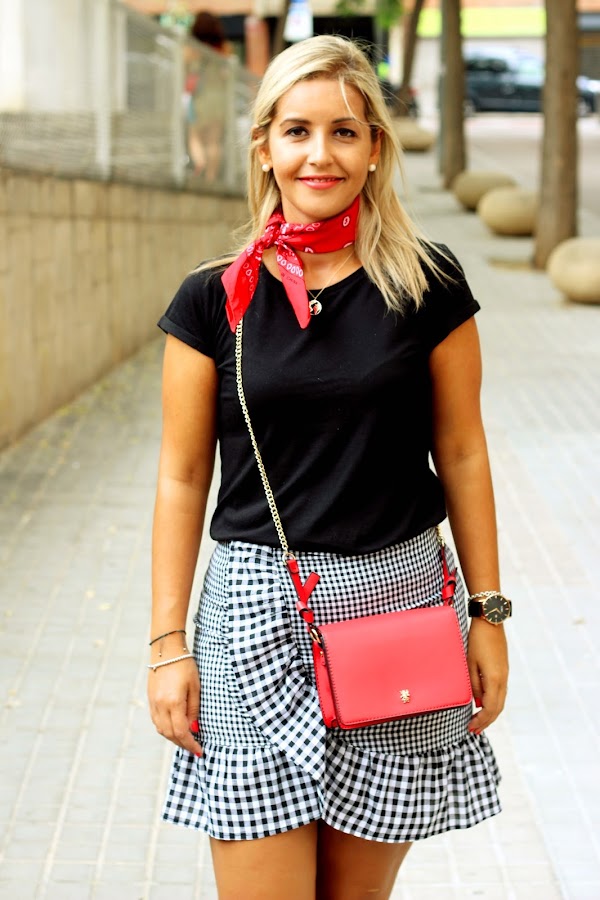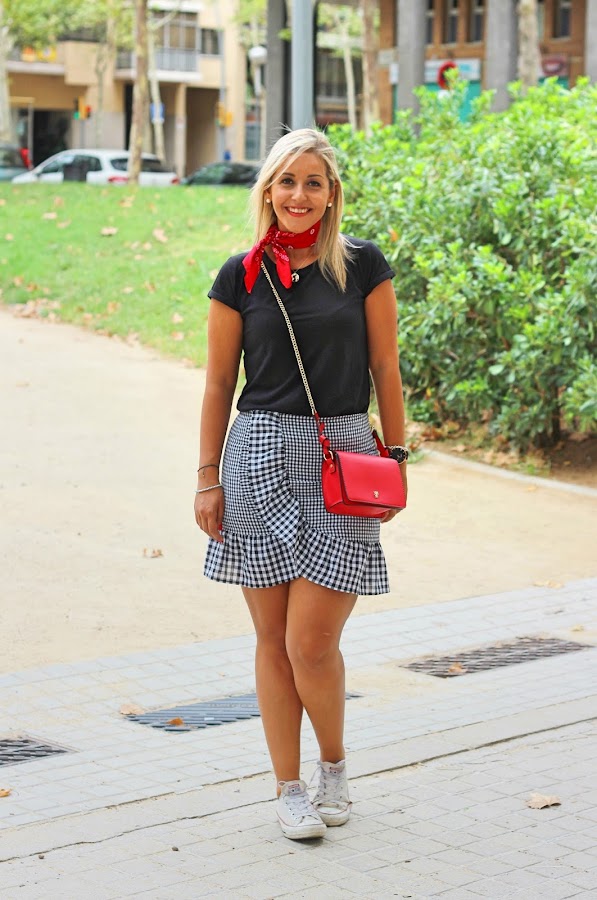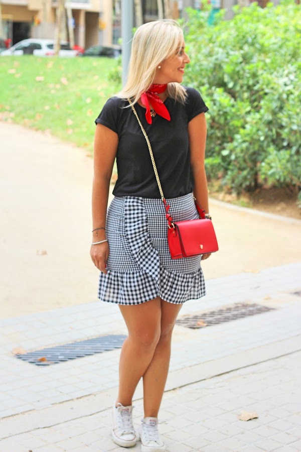 Hoy os enseño un look casual, super sencillo y perfecto para el fin de semana. En el look de hoy llevo mi nueva falda de pata de gallo de Zaful que me encantó por el detalle del volante. La combiné con una camiseta negra básica, ya que el binomio blanco y negro nunca falla. Decidí darle un toque de color al look con la bandana y el bolso rojo. El resto de accesorios fueron mis converse y una gargantilla con la bola del mundo.