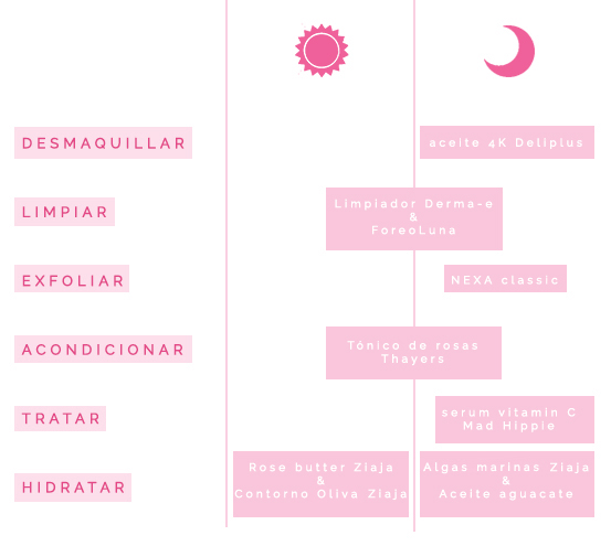 Ahora te traigo una rutina actualizada, creo que más consciente que nunca, en muchos sentidos, conociendo mi piel mucho mejor y habiendo leído mucho para saber el porqué de cada reacción en mi rostro.