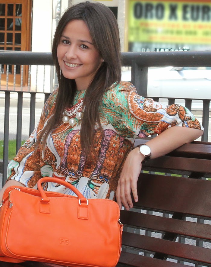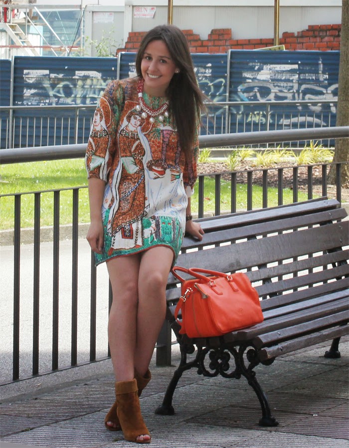 De primeras no pensé ponerle complementos, pues el estampado tan llamativo y poco común con un dibujo de un Santo no necesita más, pero se me ocurrió probarlo con uno de mis collares favoritos y el efecto me encanto. Unos botines, bolso naranja y ¡lista! ¿Qué os parece?