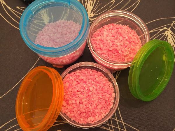 Juega con los colores y aromas a tu gusto, puedes preparar las sales rosas, azules, amarillas... con aroma a rosa, lavanda, azahar....