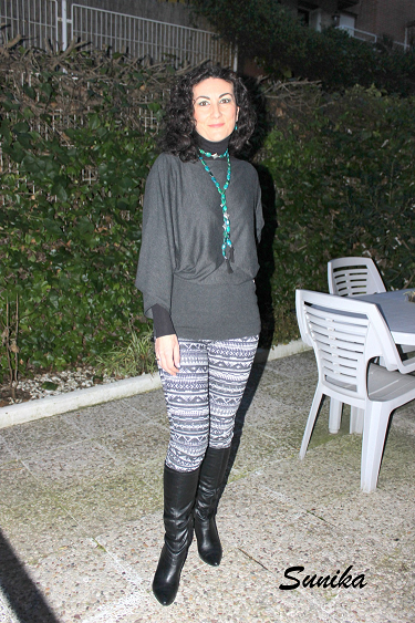 En esta ocasión llevo un suéter fino de manga japonesa y unos leggins estampados en negro y gris. Cómo por la noche refrescaba y yo soy muy friolera me puse una camiseta negra debajo. Aportando color un collar en verde turquesa realizado por una amiga que hace unos collares preciosos.