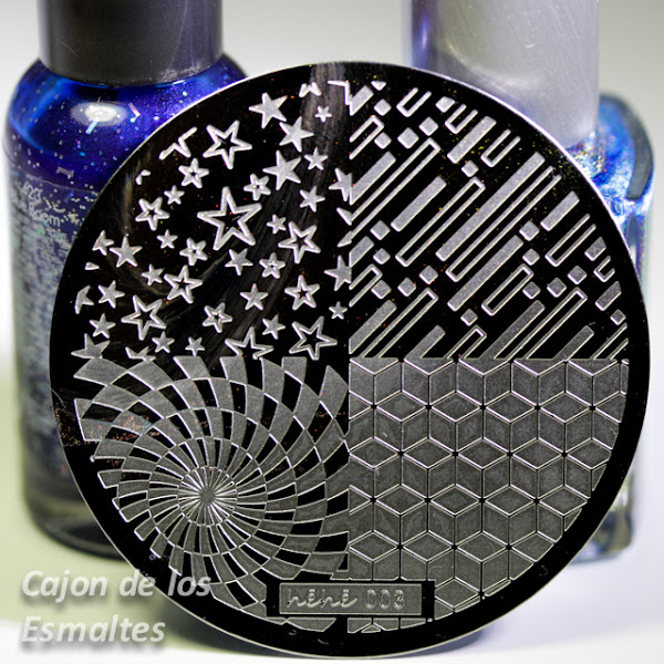 Y como siempre antes de pasar por la muerte en acetona probamos un estampado, el azul y el holo me recordaban a un cielo estrellado así que fui por ese diseño de la mano de la placa he he 003 cortesía de Aliexpress. El color para estampar fue un holográfico celeste de Color Club para no salir del tema.
