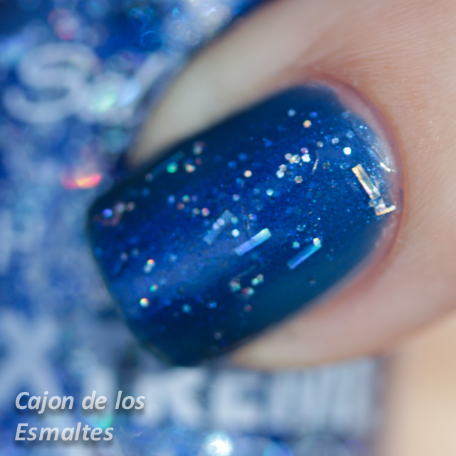 Para la ficha técnica, en las fotos está con dos capas medianas y topcoat. Si son de aplicar capas finas seguramente necesiten tres para cubrir completa la uña. No es necesario hacer malabarismos con la distribución de glitter y a pesar de que no son gran fan del glitter en "barra" estos son pocos y no sobresalieron. Es un esmalte particular, al menos no tenía nada parecido en la colección, el azul va entre un color jean y un azul real dependiendo de la luz. Es un jelly sandwich pero el brillo que tiene lo hace verse como un metalizado dependiendo de la luz. Rara avis sin duda.